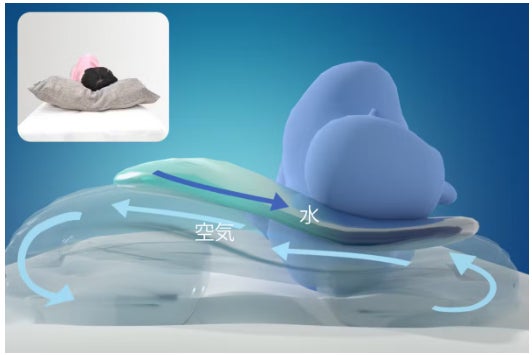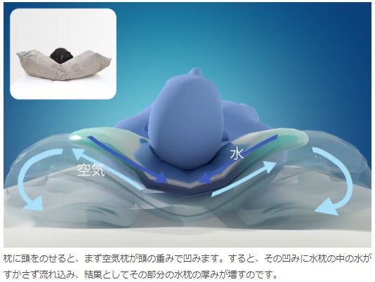 ●気体と液体と連続気泡弾性体を流体力学的に結合する新技術構造(特許取得済み)により少量の水でこれらの性能が得られる枕を実現しました。