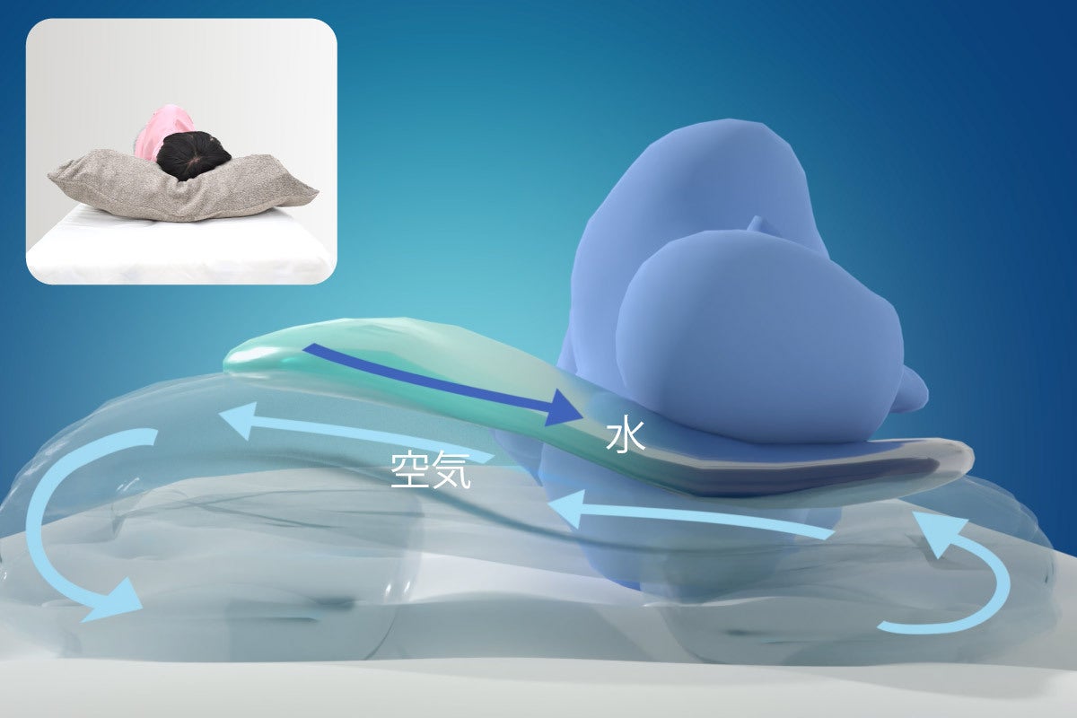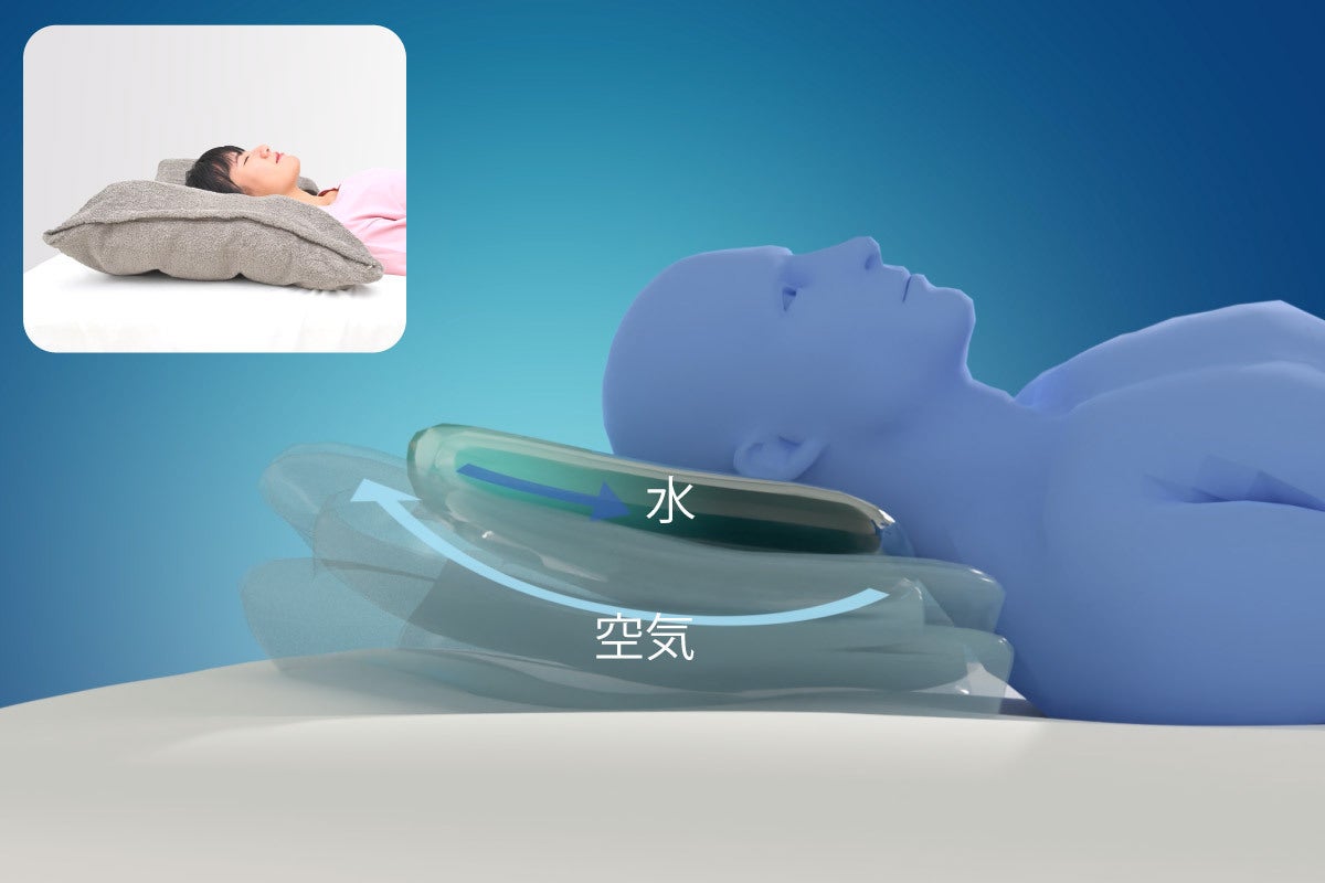枕に頭をのせると、まず空気枕が頭の重みで凹みます。すると、その凹みに水枕の中の水がすかさず流れ込み、この構造特許技術が結果としてその部分の水枕の厚みが増すのです。
