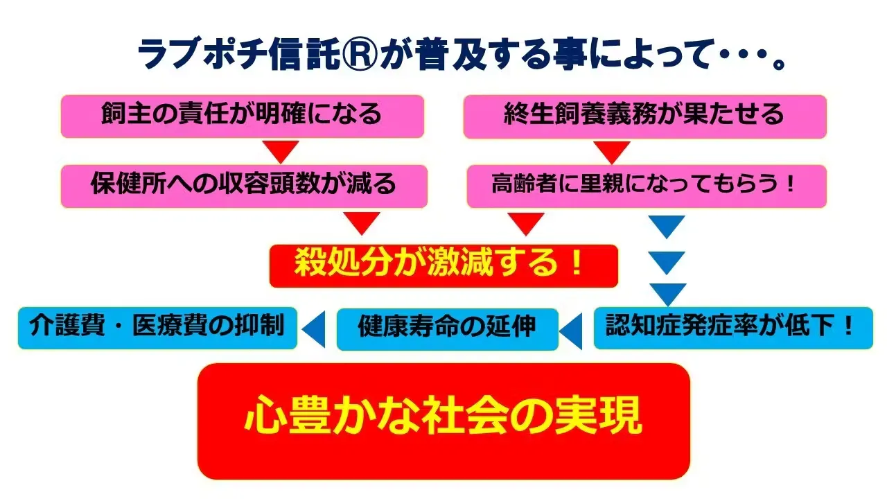 私は行政書士をしておりますが、 「自分に何かあった時の、ペットのことが心配でたまらない」という相談を受けることが多くなりました。 「こんなに幸せをくれるこの子が、自分に何かあった時、殺処分になど、絶対にさせられない」と涙を流される方もおられます。 ペットのための相続対策はいつくか方法が考えられますが、生命保険信託もしくは遺言を使うラブポチ信託🄬は、飼い主さんの負担も少なく、多くの方に安心と喜びを届けられています。 またピーサポネットさんの提携の施設も安心のできる所ばかりなのも強みのひとつだと思います。 このような、飼い主さんとペットの両方に本当に寄り添うこのとできる対策が広まって、ペットを愛する飼い主さんと飼い主を愛するペットたちが、安心して幸せに暮らせる社会となることを心より願います。 どうかあたたかいご支援、応援宜しくお願いいたします。