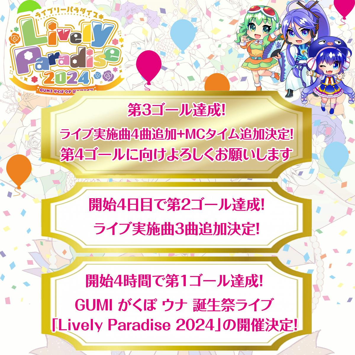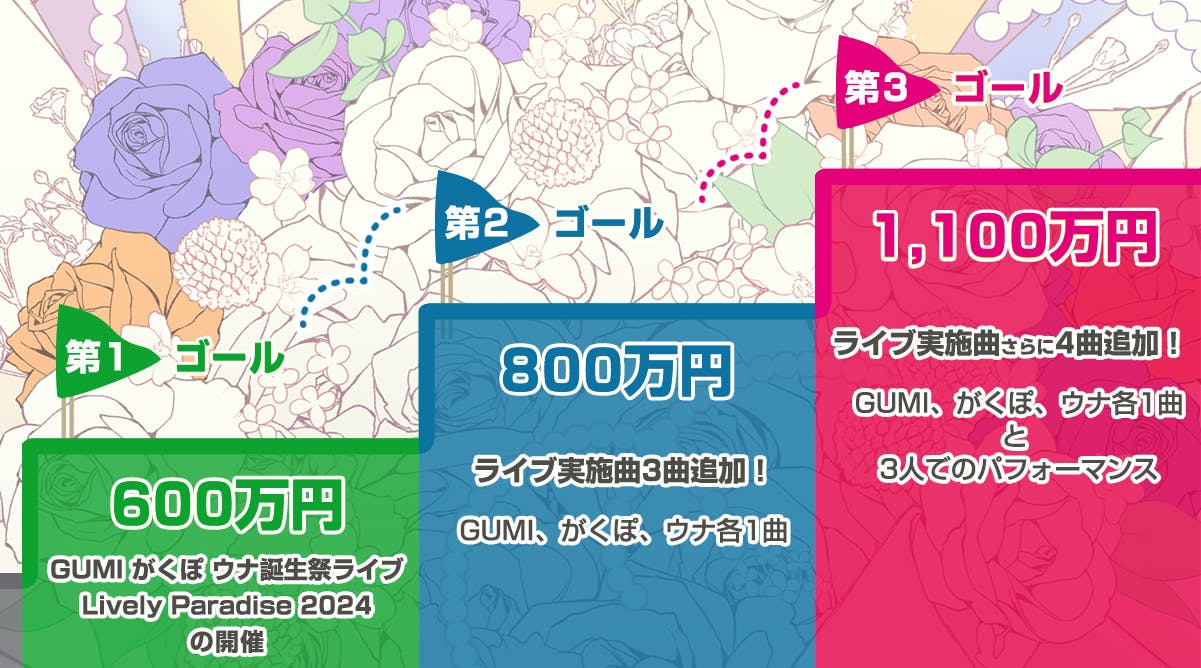 第1ゴール 6,000,000円 :「GUMI、がくぽ、ウナ 誕生祭ライブ Lively Paradise 2024」の開催