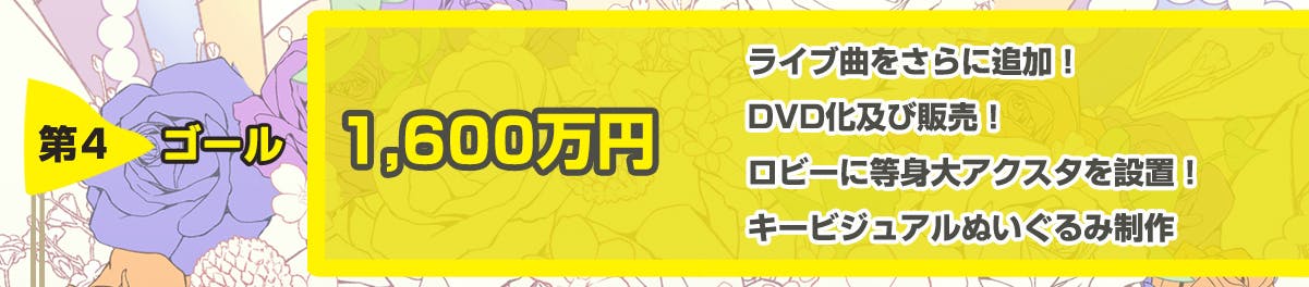 第4ゴール 16,000,000円: ライブ曲をさらに追加。 DVD化及び販売! ロビーにGUMI、がくぽ、ウナ3名の等身大アクスタを設置。キービジュアルぬいぐるみ制作