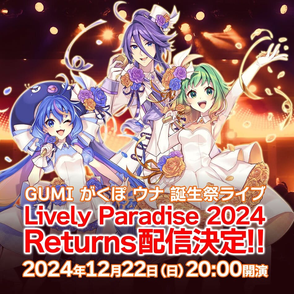 「GUMI がくぽ ウナ 誕生祭ライブ Lively Paradise 2024」(#ライパラ2024)を開催し、3人一緒のパフォーマンスやソロパートのパフォーマンスなどで誕生祭を盛り上げます。