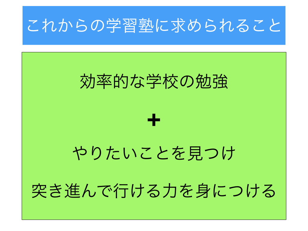これからの学習塾には効率的な学校の勉強➕やりたいことを見つけ、突き進む力を身につけるお手伝いが必要になっているのではないかと感じています。