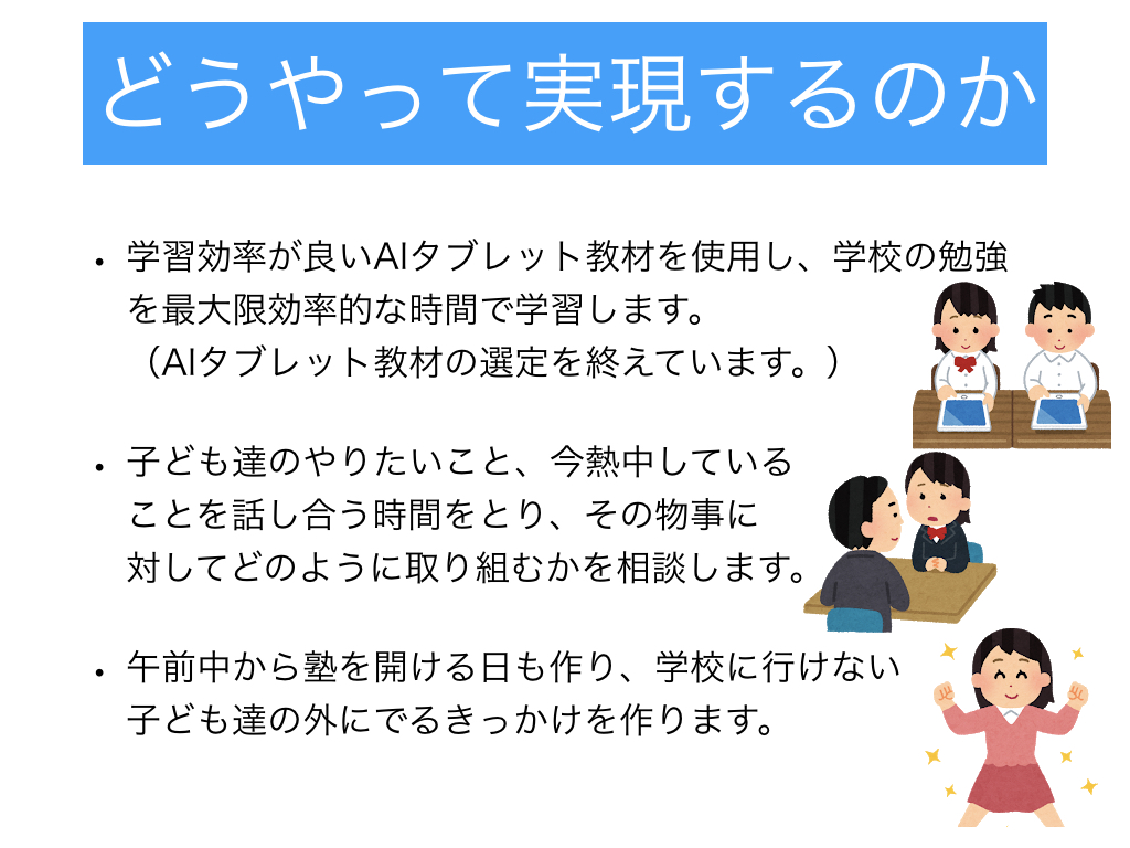 また、午前中から塾を開く日を作り、学校に行けない子が外に出る、勉強するきっかけを作る塾にもしていきます。