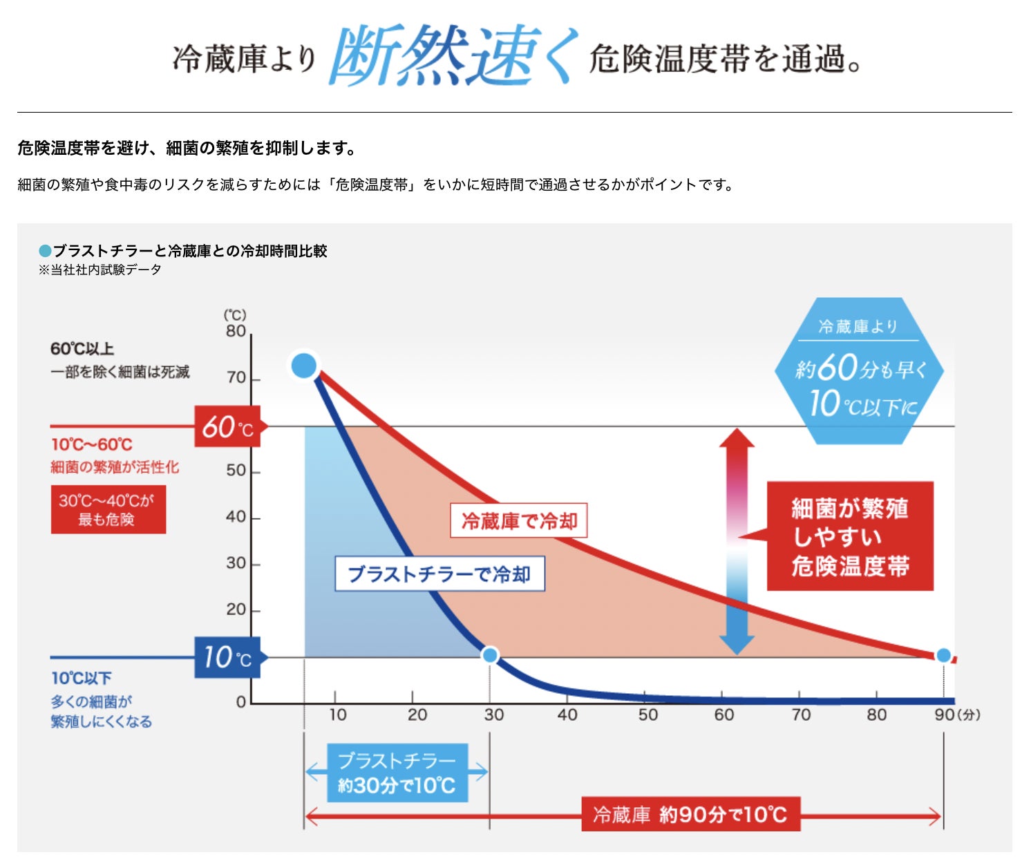 ご家庭で料理を作ったときも同様ですが、温かい食品を冷ましている途中に、微生物が増えやすく食中毒などの危険性が高まる「危険温度帯(10〜60℃)」を通過します。ただ冷ましている時には、危険温度帯を通過するのに時間がかかってしまうのですが、ブラストチラーはお菓子が焼き上がってすぐ熱々の状態からそのまま急速に冷やすことが可能なので、短時間(※)で危険温度帯を通過するため、新鮮な美味しさをキープしたまま品質管理ができるようになり、とても衛生的です。