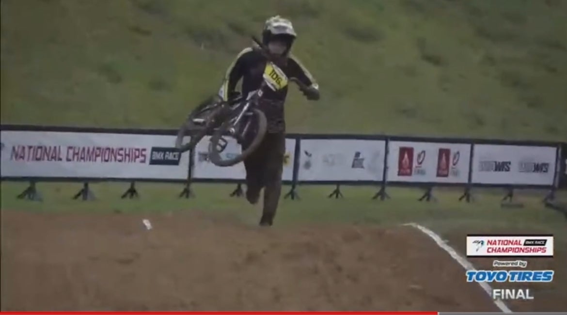 全日本選手権は、決勝で転倒して石がブレーキに挟まって動かなくなり、BMXを抱えて走り ゴール