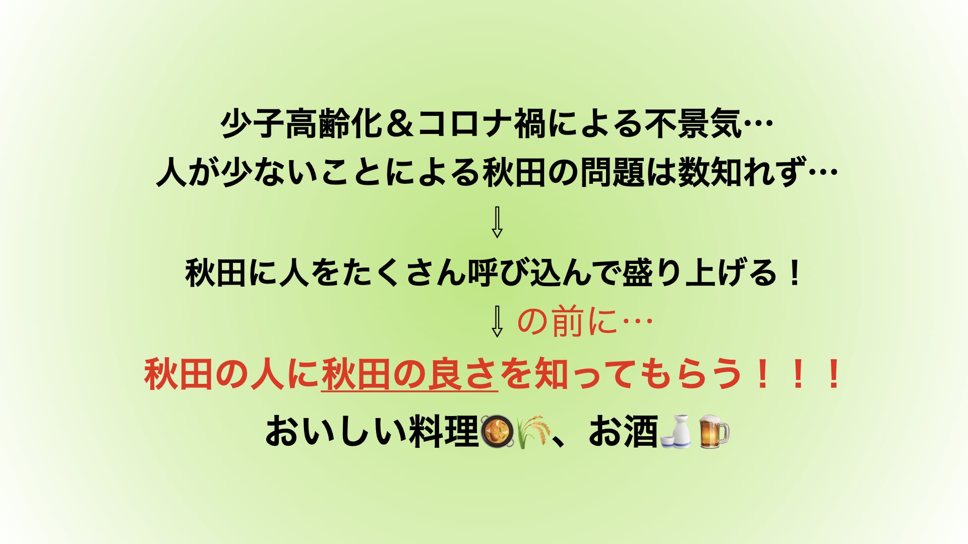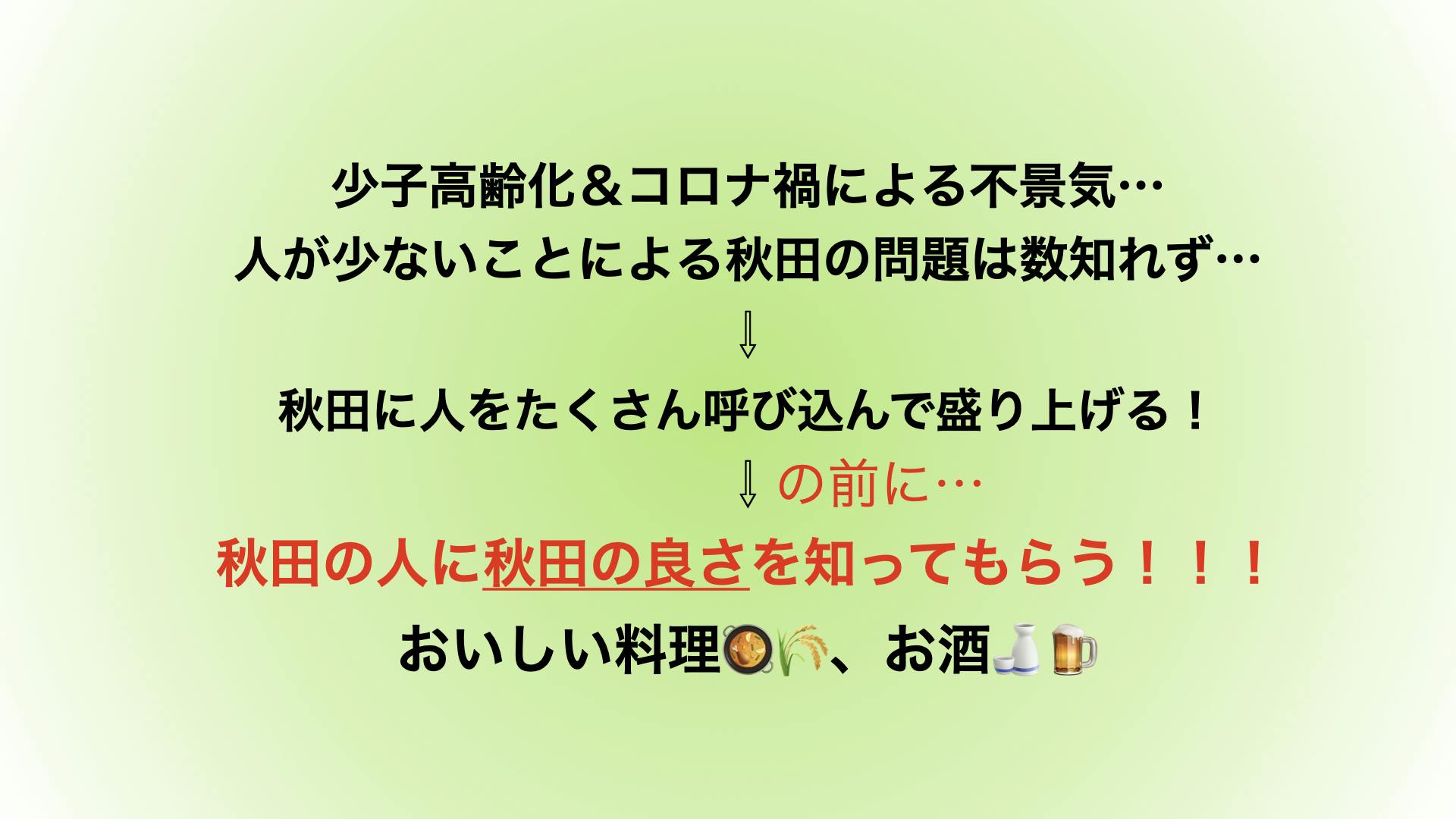 コロナの恐ろしさに外出を自粛し、食事は家で、黙々としていたことは記憶に新しいでしょう。当時の外食控えにより、秋田の飲食店はみな大打撃を受け、閉店してしまったお店も多くあります。そして現在、外に出かけて食事をするのを控えるという習慣が身についている人も少なくないのではないでしょうか?秋田には本当に素晴らしい飲食店がたくさんあります!プロの生み出す味はもちろん、店員さんの温かい接客や、そのお店で出会う人との交流、一緒に食べる人とのおしゃべりなど、お店に行かないと味わえない幸せはたくさんあります。そんな素晴らしいお店が、秋田にはたくさんあるのに、知らないまま無くなってしまうのはもったいない!日本きっての観光地京都の飲食店で自分がアルバイトをしていた時も、秋田の飲食店は、味や値段、サービスなど全てにおいて全く負けていないと考えていました。秋田の人が、もっと秋田のお店について知って、地元で食事を楽しむという機会を提供したく、このプロジェクトを考案しました。