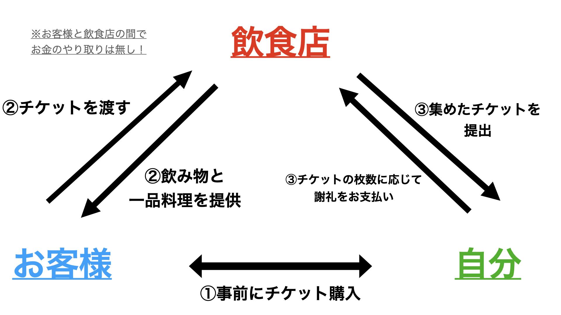 私は、秋田駅付近や川反、山王地区の飲食店と提携して、お客様にチケットを販売し、お客様は提携店舗の中から行きたいお店を自由に選び、チケットを使って一品の料理と一杯の飲み物を楽しみます。そして、お店の味や雰囲気を堪能したら、また次のお店に行き、お気に入りのお店を発掘します。イベント終了後に、提携店舗に使われたチケットの枚数に応じて私は店舗に謝礼をお支払いします。