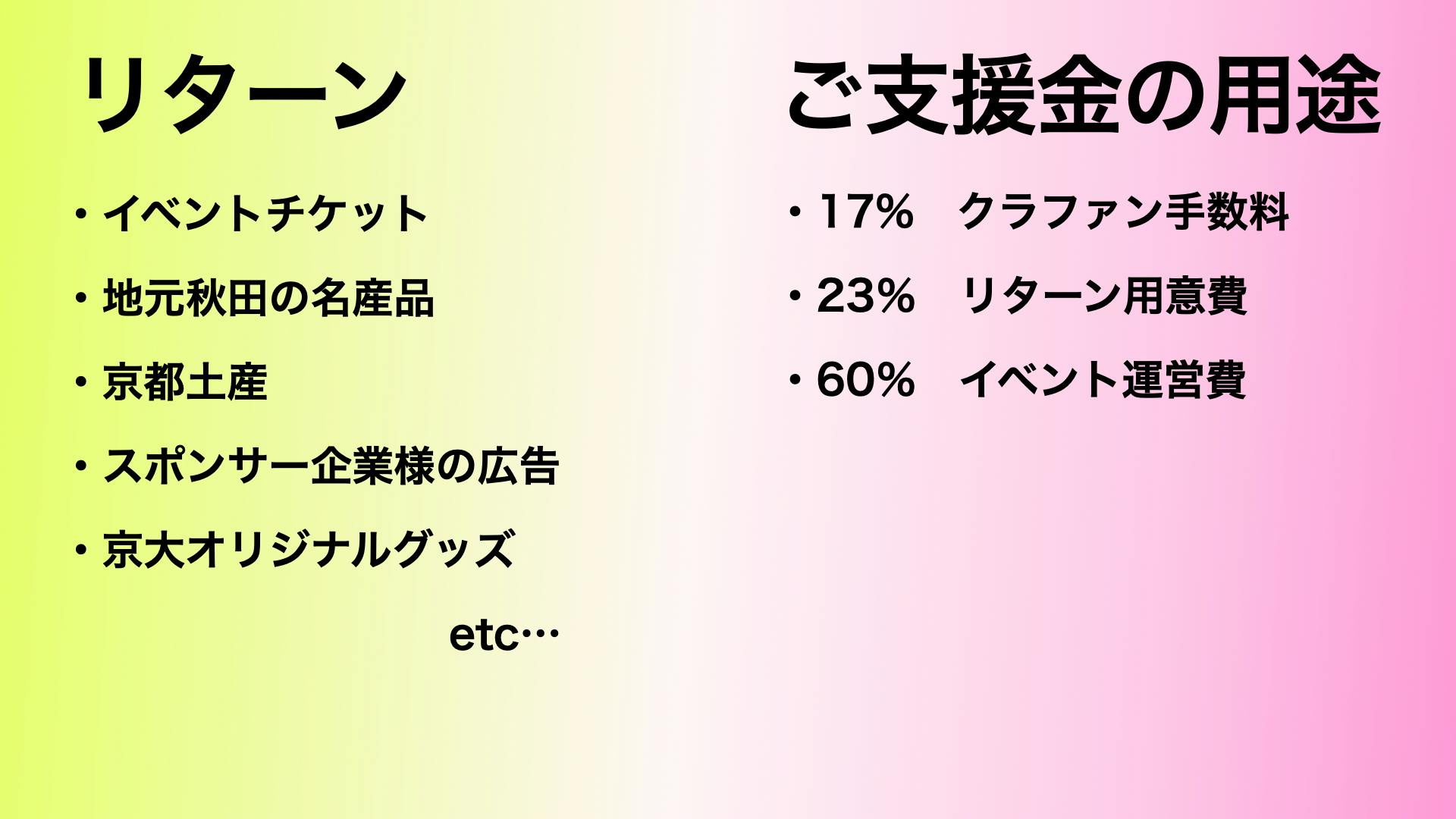 支援者の皆様には様々なリターンをご用意しています!例えば、イベントチケットや秋田、京都の特産品をお送りします。また、支援者様のロゴやお名前を、広告として掲載するリターンもご用意しています。支援していただいた方々には、感謝の気持ちをふんだんに込めたお礼をさせていただきます!