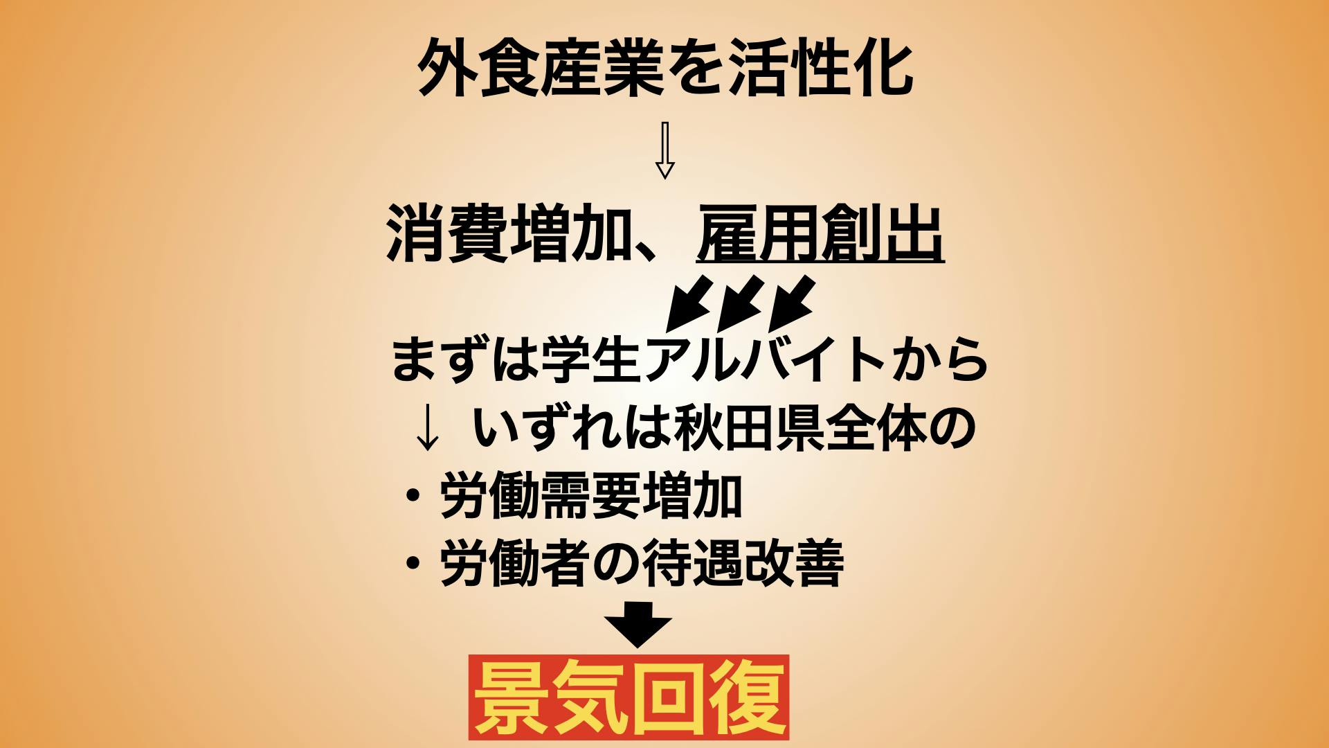 以上のように、自分は秋田の飲食業を盛り上げるイベントを開催したいと考えておりますが、同時に、秋田での”雇用の創出”にも貢献できたらと考えております。学生の身で、アルバイトを多く経験して参りましたが、秋田の友達からは、やはり秋田は「働く場所がない」や「賃金が安い」という声を多く聞きます。そこで、飲食店を盛り上げることで、飲食店のアルバイトの需要を増やし、その要望に対して、秋田で働きたい学生をこちらで紹介するマッチングの仕組みを作りたいと考えています。お店が欲しがる人材にしっかり適した人をこちらで紹介することで、お店の負担を減らすことができ、アルバイト側としても時給が最低賃金よりも高くなることが期待でき、双方にとって良い結果をもたらすことができると考えています。 まず自分が携われるのは”学生アルバイト”についてですが、それによって秋田の景気を改善させながら、”若い人が嫌がらない秋田”を作ることができたらと考えています。そしていずれは、アルバイトに限らず、秋田の労働環境全体の改善に努めていきたいと考えています。