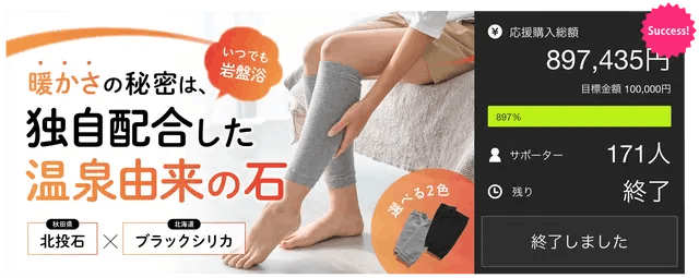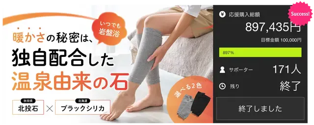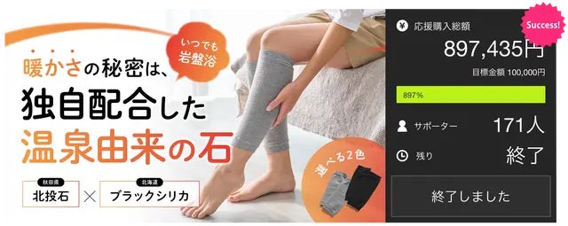 また、長年携わっている秋田県・玉川温泉の「北投石」の加工技術を活用し、北海道上ノ国町で採取されたブラックシリカを扱った商品の開発にも注力。前回ご紹介した「岩盤浴レッグウォーマー」では多くのサポーターの皆さまにご支援いただきました。