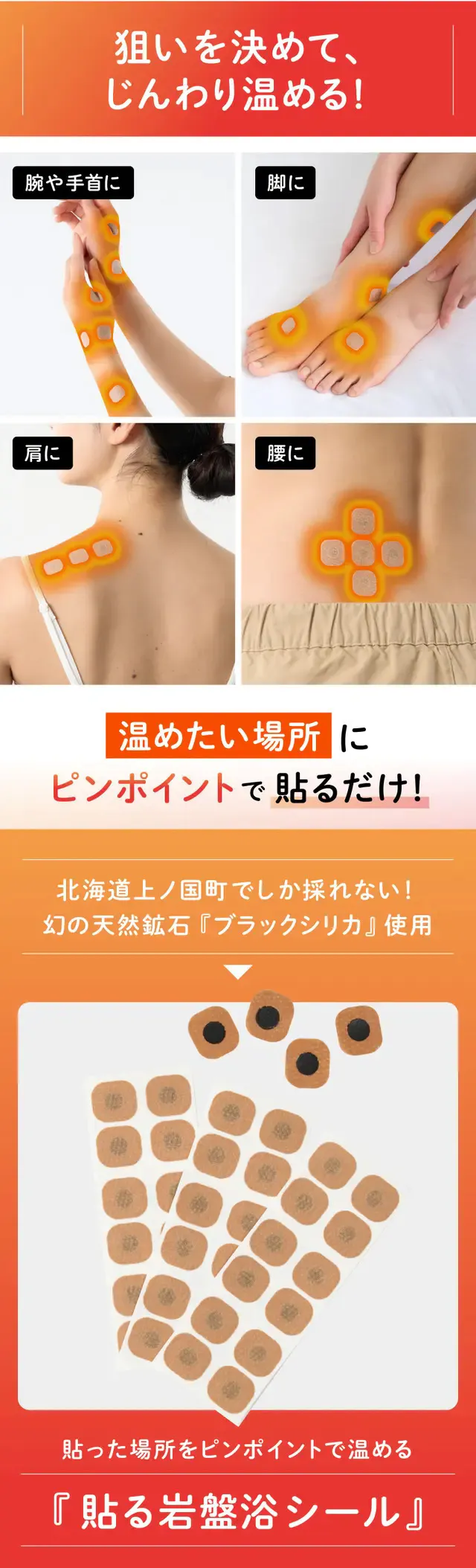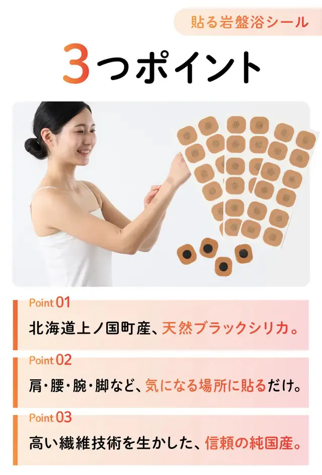 今回ご紹介する「ブラックシリカ岩盤浴シール」は、北海道上ノ国産ブラックシリカの遠赤外線で、肩・腰・腕・脚・手先・足先といったピンポイントの場所に貼るだけで、その部位をじんわり温めくれる商品です。目立ちにくいので、薄着になる夏場でも気兼ねなくご利用いただけます。