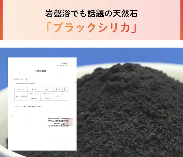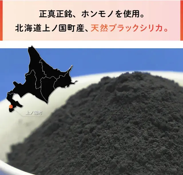 「貼る岩盤浴シール」では、正真正銘、北海道上ノ国町産のブラックシリカを100%使用しています。