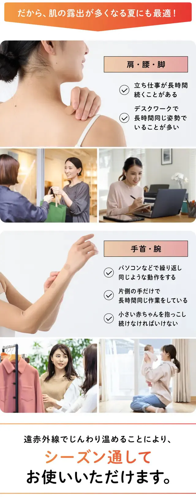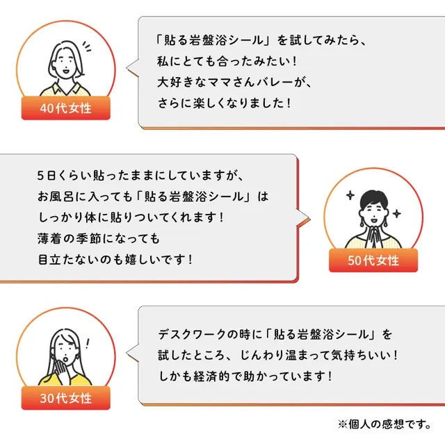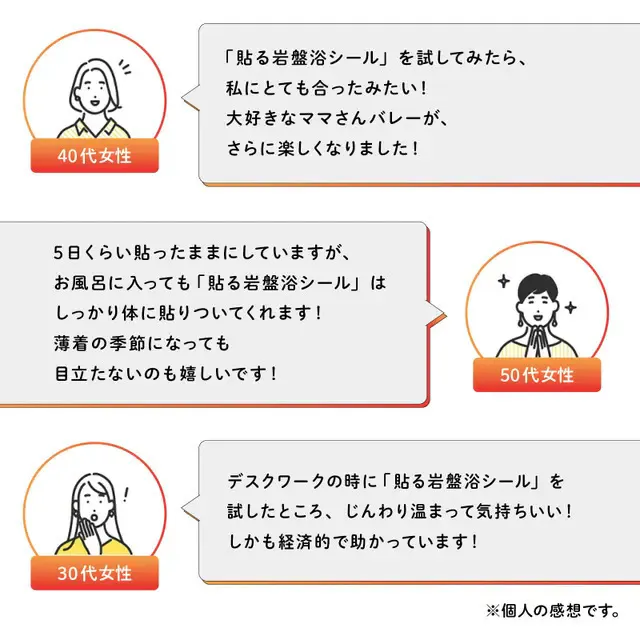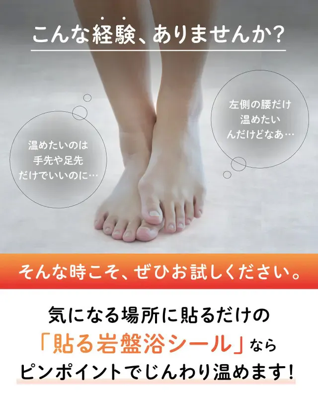 「貼る岩盤浴シール」は、その名の通り気になるところに「貼る」だけで、ピンポイントにじんわり温めてくれるパッチタイプ。手や腕など露出の多いところに貼っても目立たず、薄着になる夏場でも、気兼ねする必要はありません。