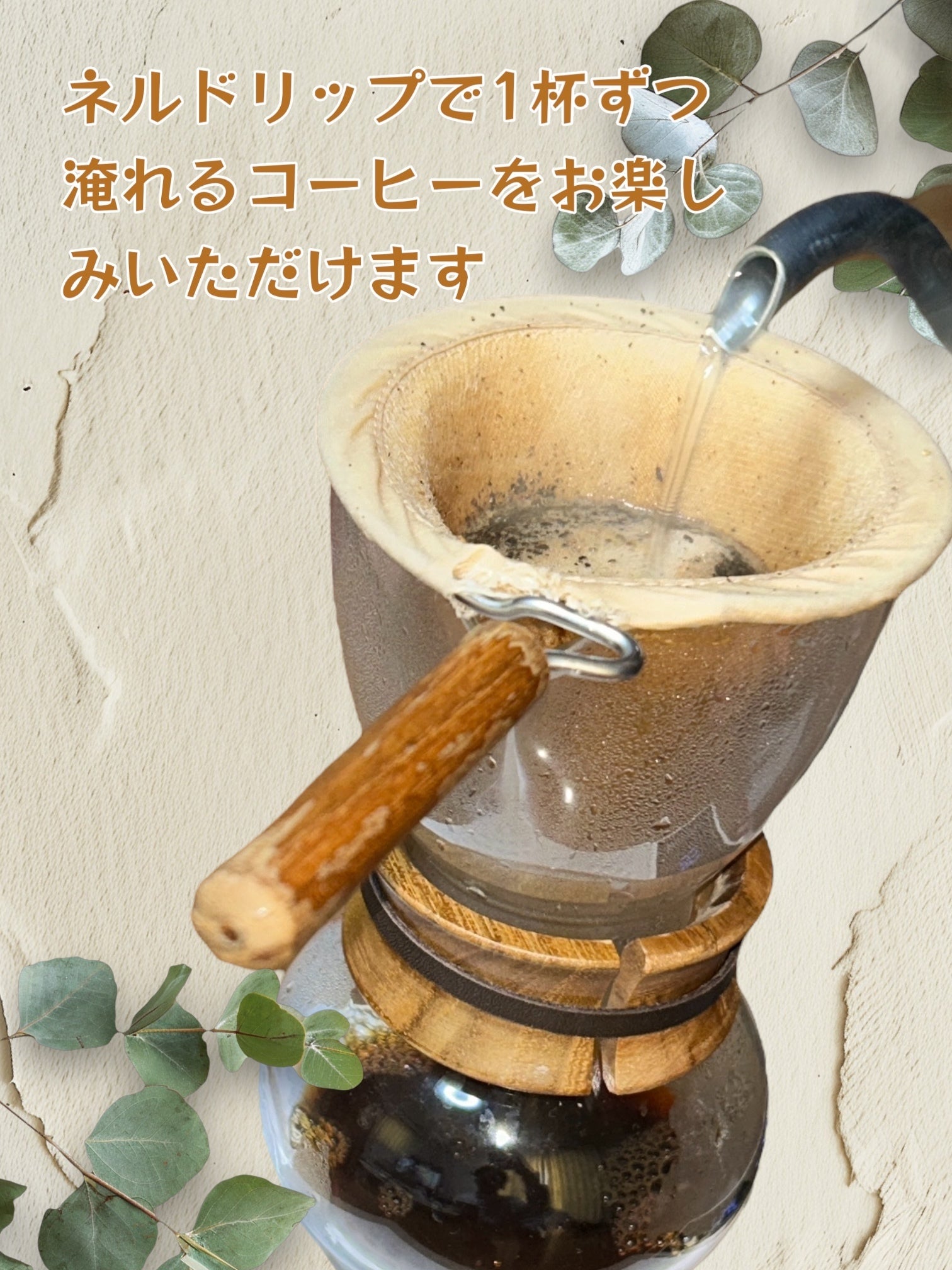 ネルドリップでコーヒーを抽出すると、コーヒー液の中の粒子がネルの起毛面にとどまって液体側に落ちるのを防ぐことができ、「舌触りの滑らかなコーヒー」になります。