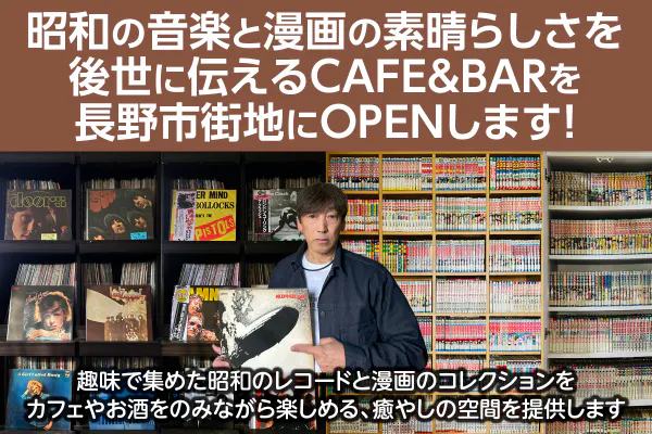 それは若い頃に思い描いていた自分の「喫茶店」を持ちたいという夢です。この喫茶店をやりたいという思いが次第に強くなりましたが、ただ普通の喫茶店は他にも沢山あるので、一味違ったコンセプトでやりたいと考えた時に「昭和」をコンセプトに、長年趣味で集めてきた「漫画」と「レコード」を皆さんに見て、聴いて、昭和の時代の良さを知って欲しい、多くの方々に昭和の作品の素晴らしさを広めていきたいという思いから、これらを活かしたカフェ&バーが出来ないか、と思ったことが今回のプロジェクトを開始したキッカケです。