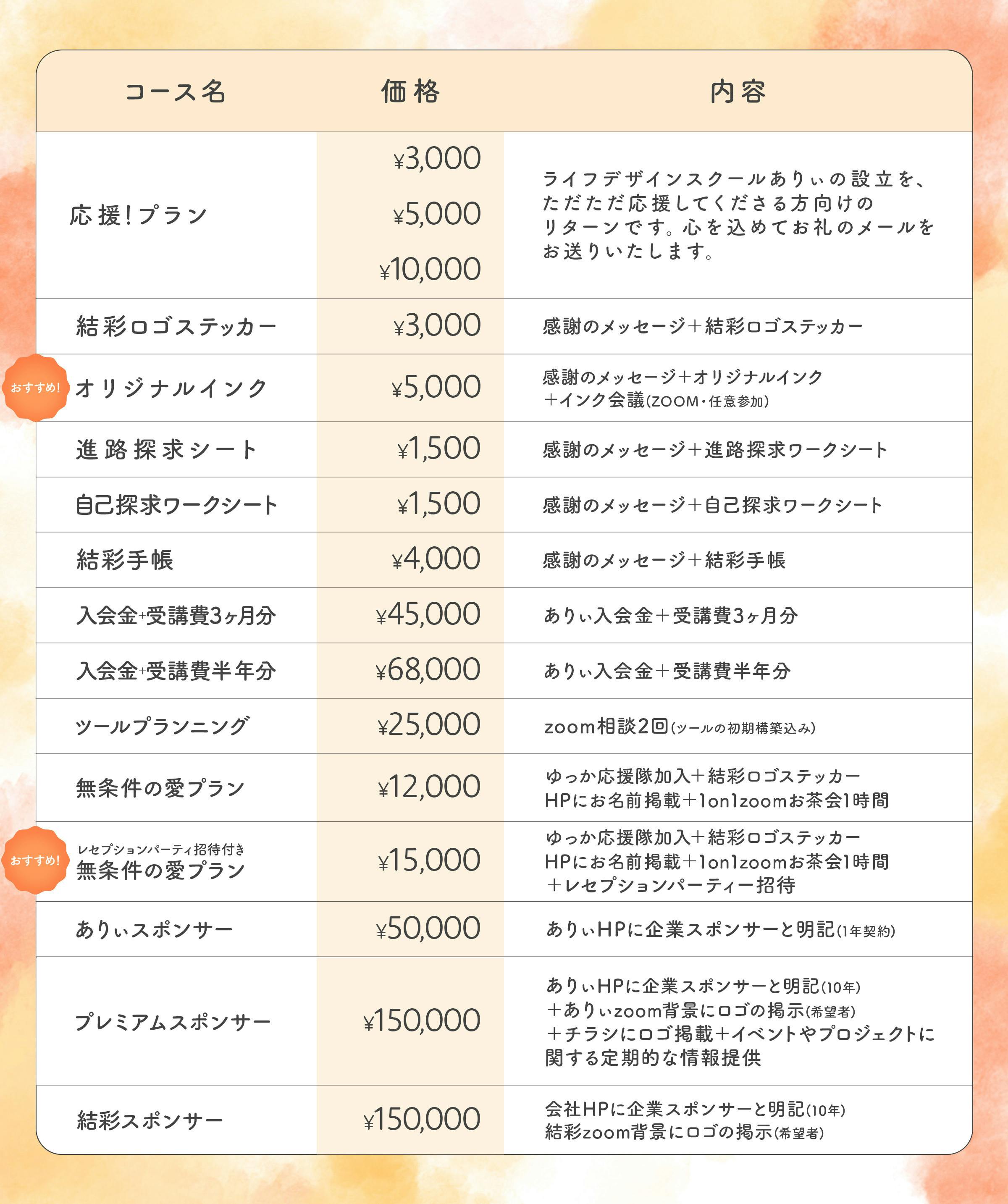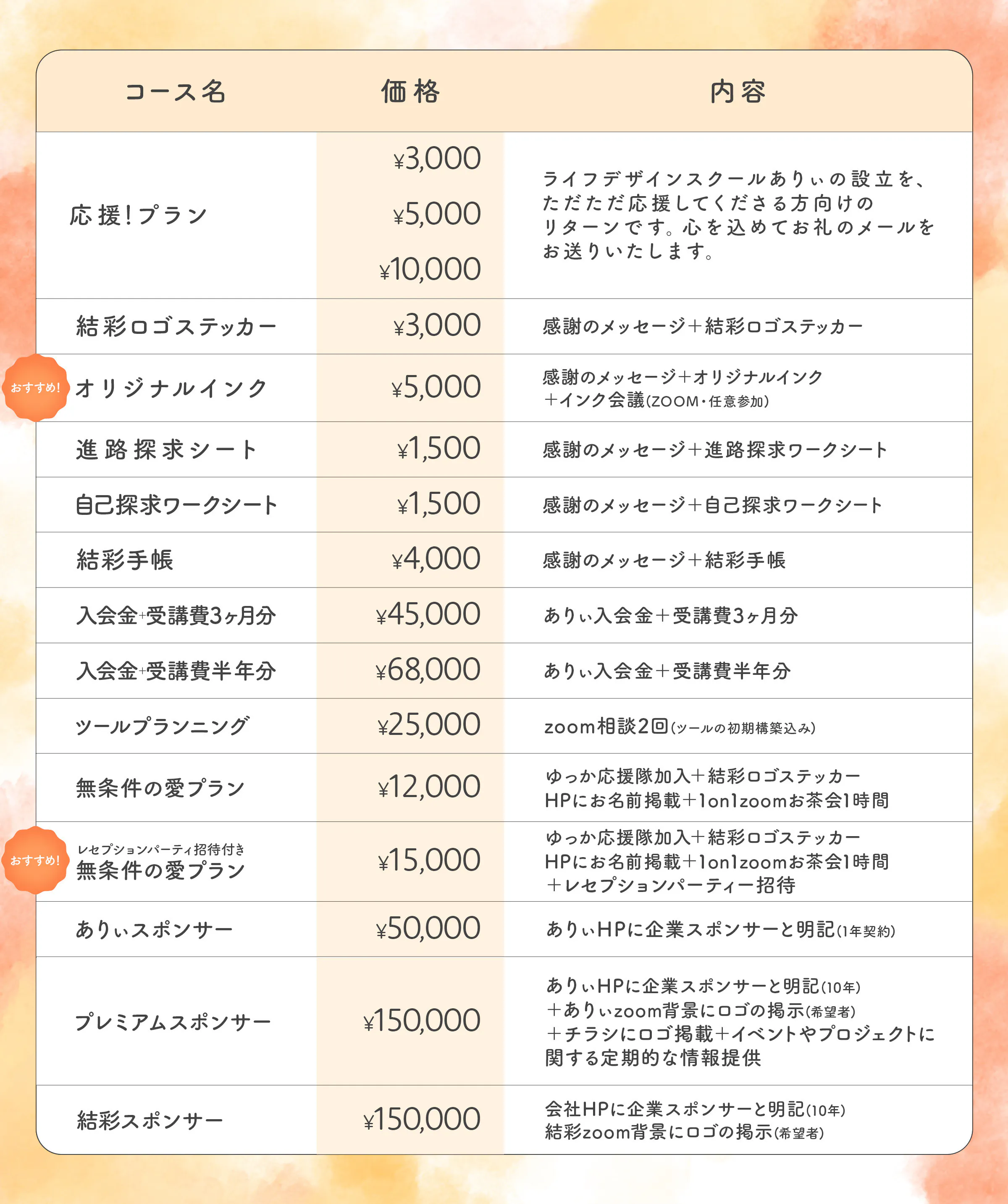 ライフデザインスクールありぃの実現を応援してくださる皆様へ
