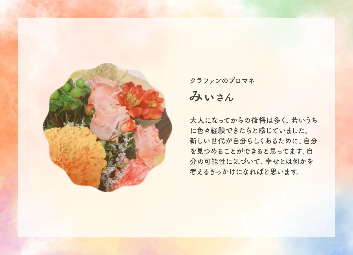 「誰かのための人生」ではなく「自分の人生」を生きる人、自分を生きることが愛しくて楽しくてたまらない人を増やしたい。なんとなくで進路を決める人を減らしたい。