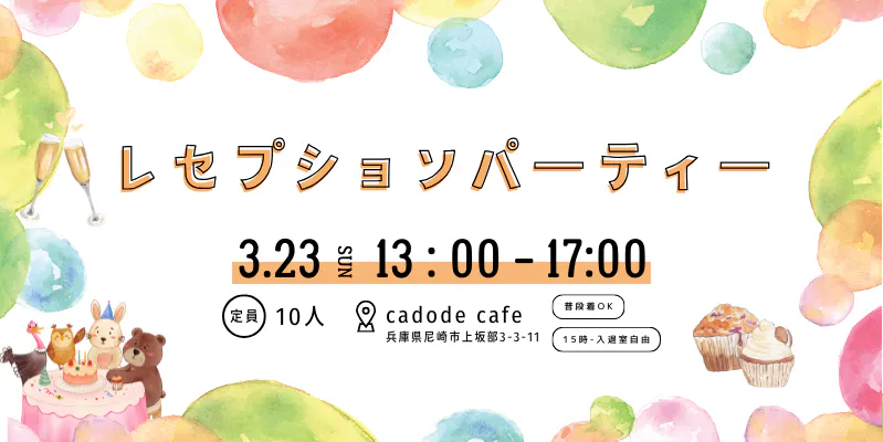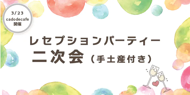 レセプションパーティーの15時-17時は入退室自由となっております。二次会(15時-17時)にお越しください。