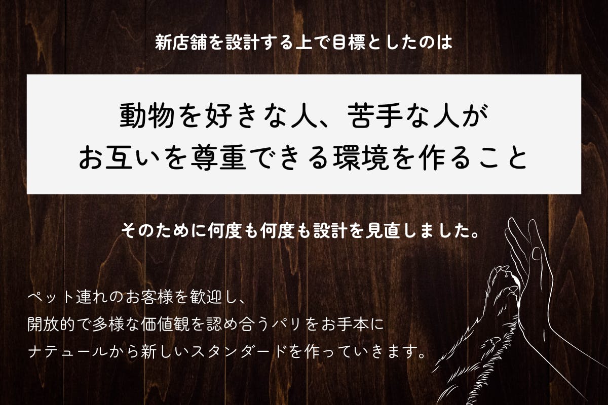 ペット同伴について賛否両論あるのは十分わかっていますが、地元で15年も愛されてきたナテュールだからこそ、お客様と一緒に取り組める新事業だと思っています。開放的で多様な価値観を認め合うパリをお手本に「こうあるべき」という固定概念を脱ぎ捨て、ナテュールから新しい価値を生み出していきます。