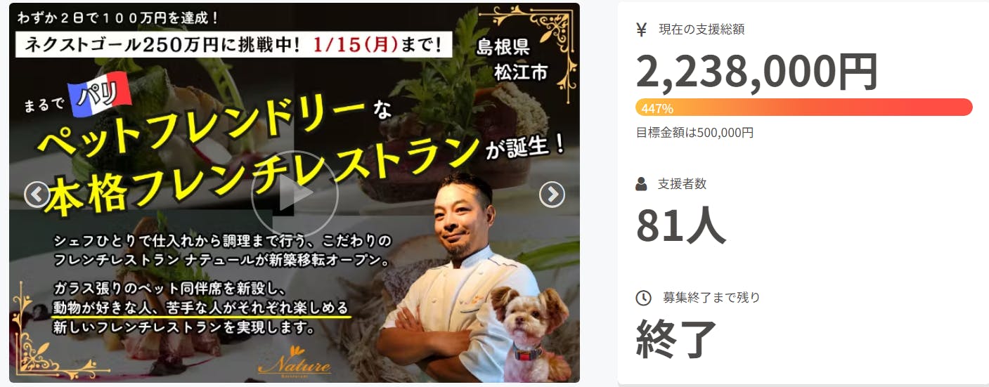 クラウドファンディング第1回(2023/12/15~2024/1/15)では、わずか1か月間で2,238,000円のご支援をいただきました。ナテュールの新しい挑戦に賛同しご支援いただき、誠にありがとうございました。