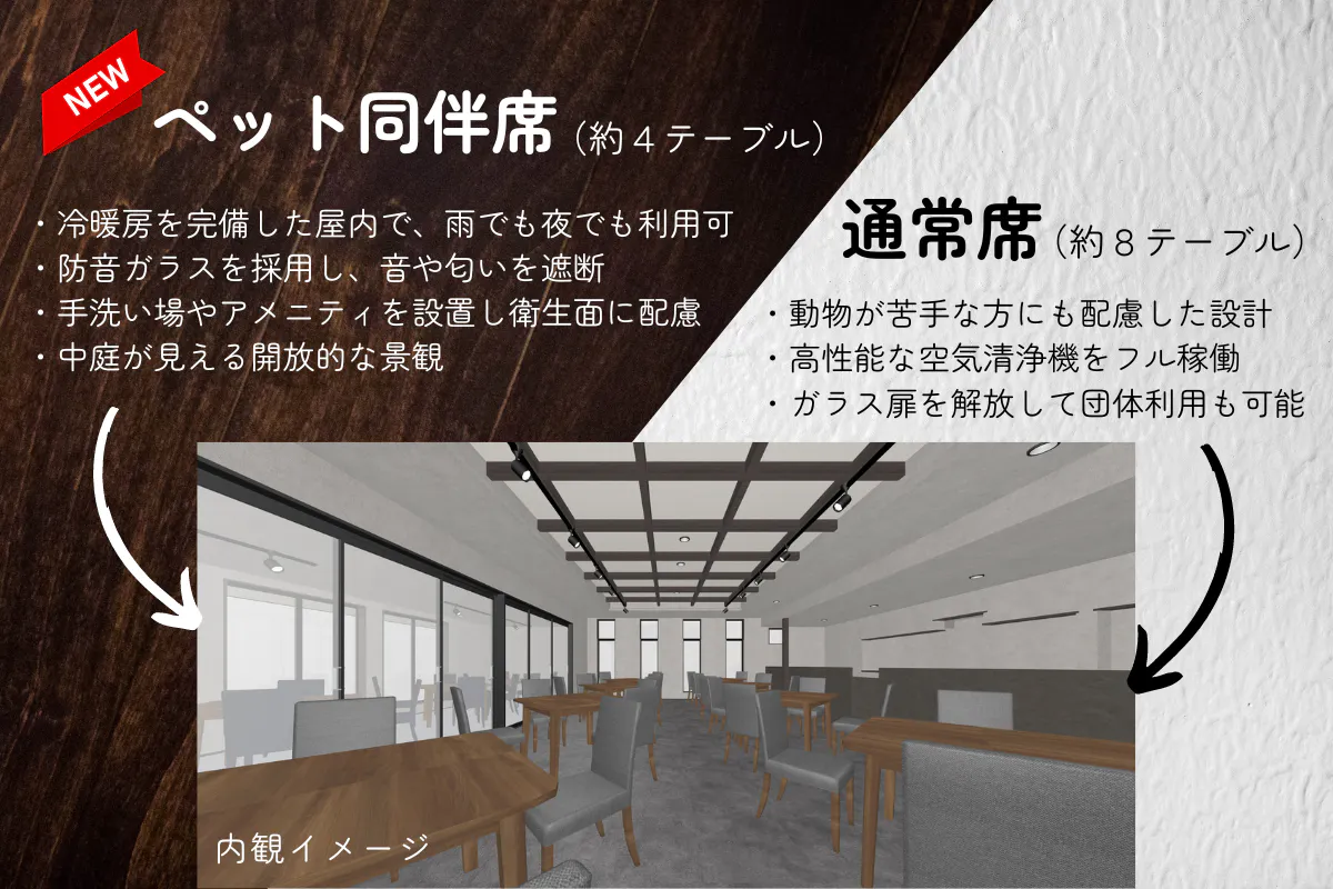 そこから長い間、ペットと一緒に楽しめる環境を提供できないか検討した結果、ペット同伴席を設けた新店舗を新築することを決断しました。