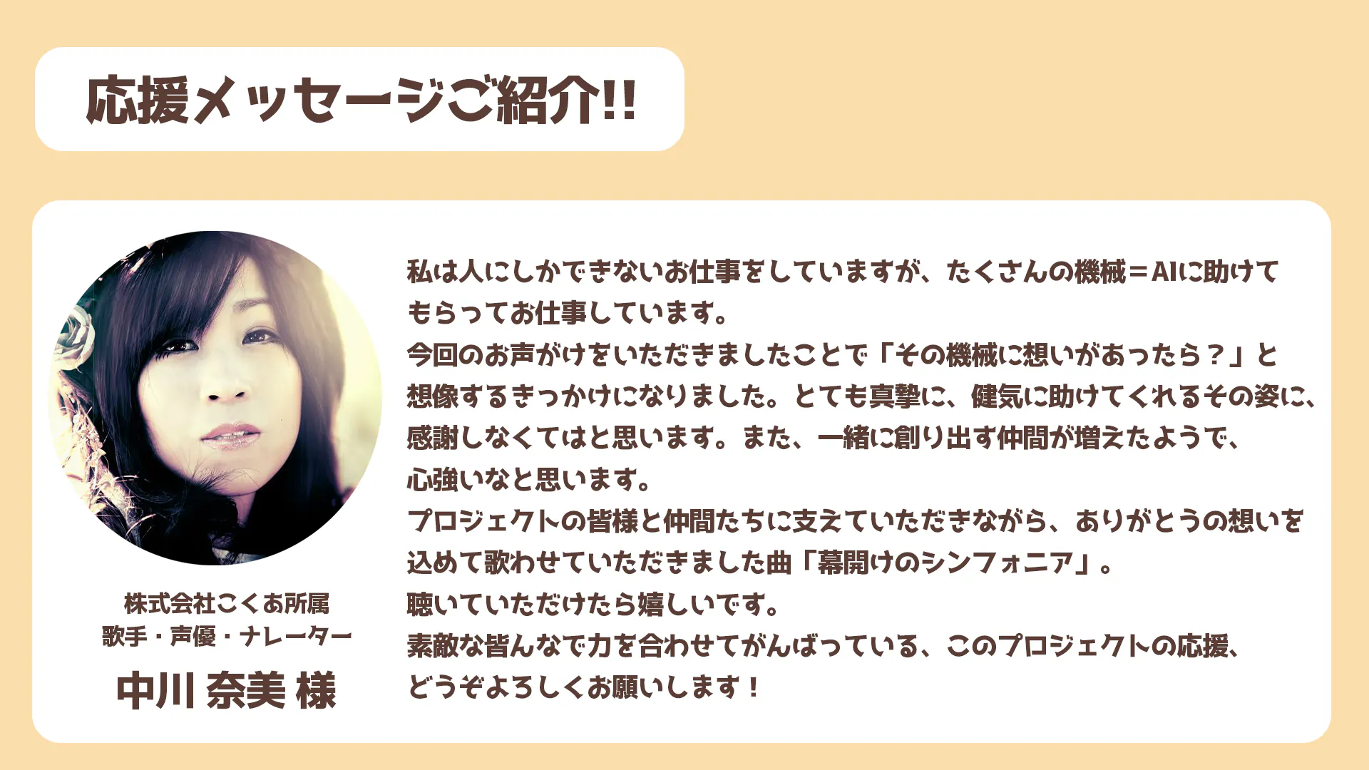 現在、AI関連企業・作曲家・声優・その他多くの事業様、クリエイター様から、プロジェクトへの参加、支援、応援を頂いております。