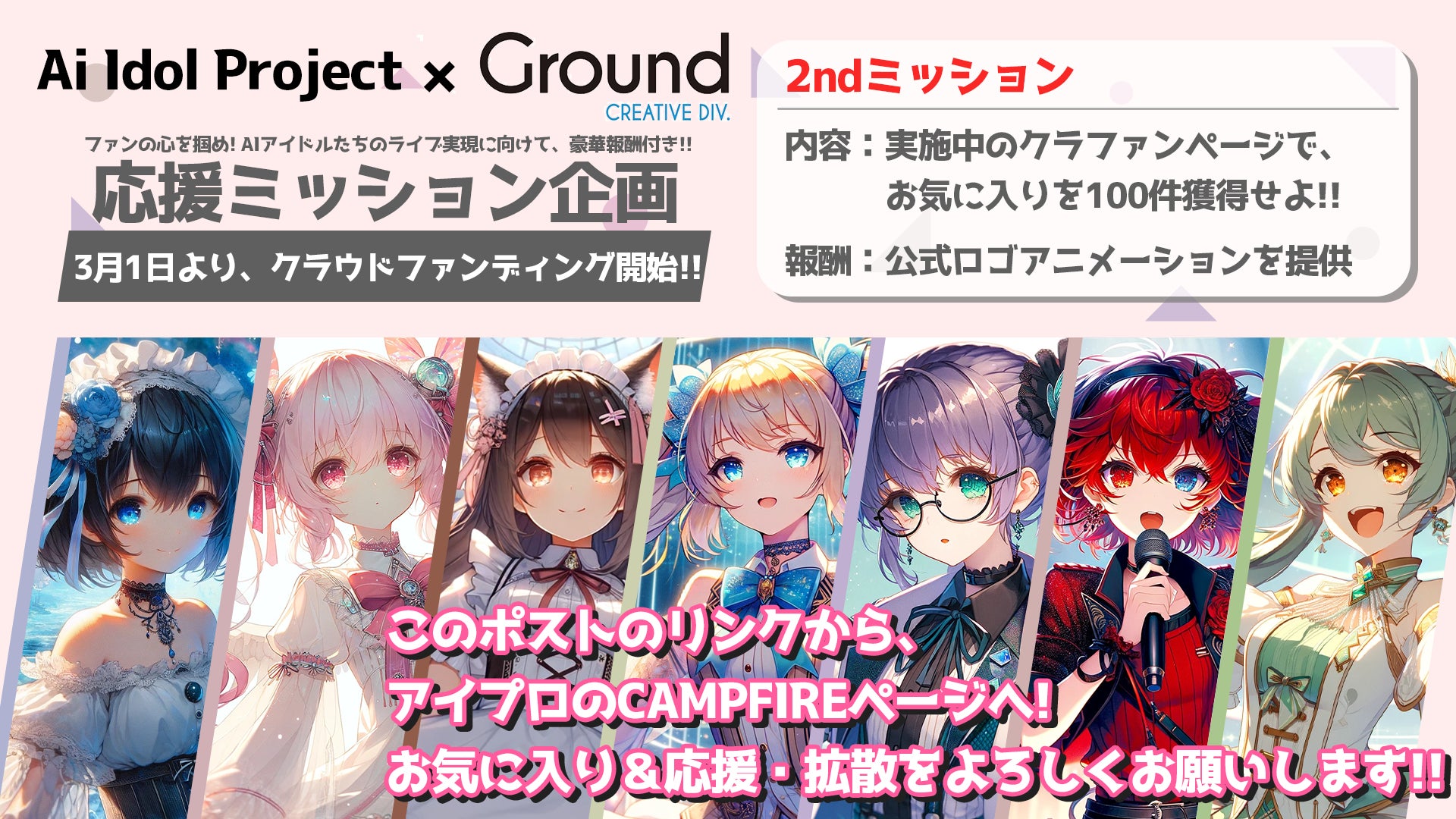 株式会社グラウンドCD様より応援企画を提案していただきました。現在、1stミッションを達成し、2ndミッション企画が進行中。