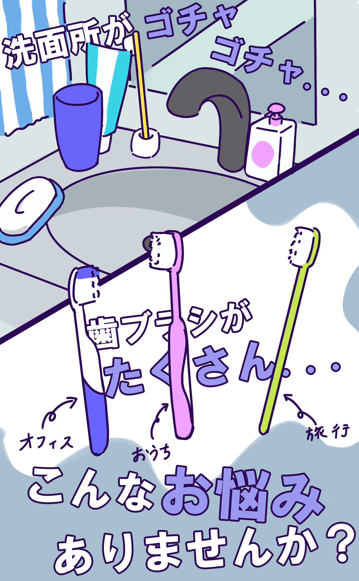水回りをきれいに保ちたい、しかし歯ブラシスタンドにコップに歯磨き粉に。用途に合わせて揃えていたら結局洗面台がもので溢れてしまいげんなり....旅行や出張に普段使いの歯ブラシを持っていきたいけれど、収納やコップの必要性を考えるとトラベル用の歯ブラシを用意するしかない....