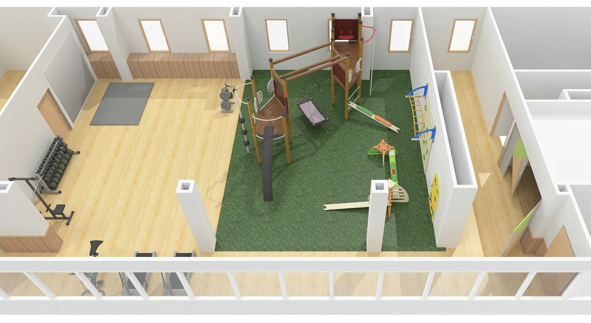2階には、エクササイズをしたい人のためのジム、そしてその横に子供達のためのアスレチックジムを作る計画です。子供達の安全も考え、大人が様子を確認しながら、自身も健康のためのトレーニングができる場所を提供します。パーソナルトレーナーの長男が、指導者として持病などのリスクやトレーニング目的もカウンセリングし、「健康維持特化プログラム」や「障害予防活動特化プログラム」という目的に合わせたプログラムも提案して行く予定です。