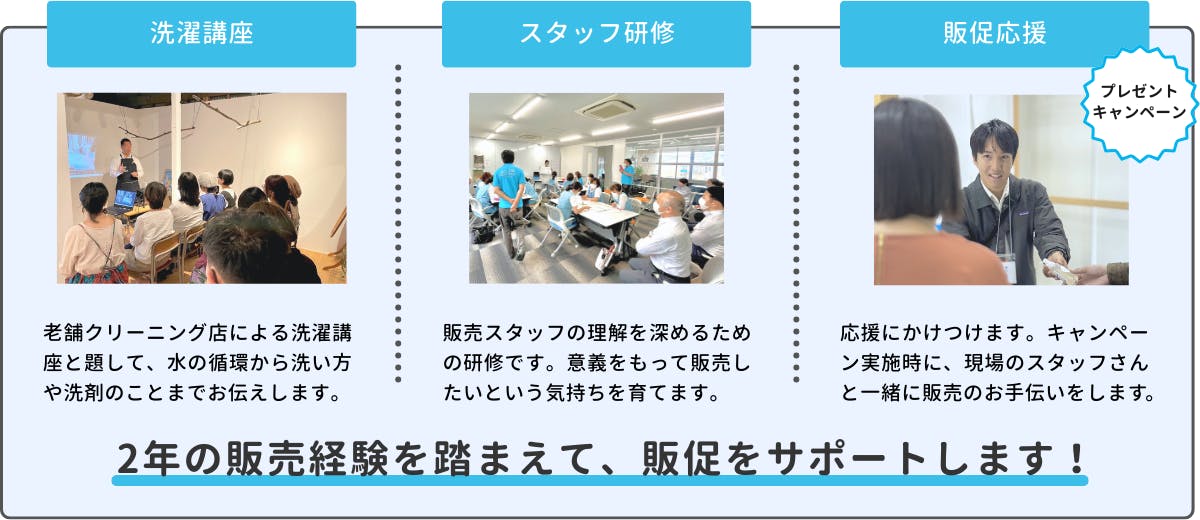 クリーニング店として、水の循環から洗い方、洗剤のことまでお伝えします。