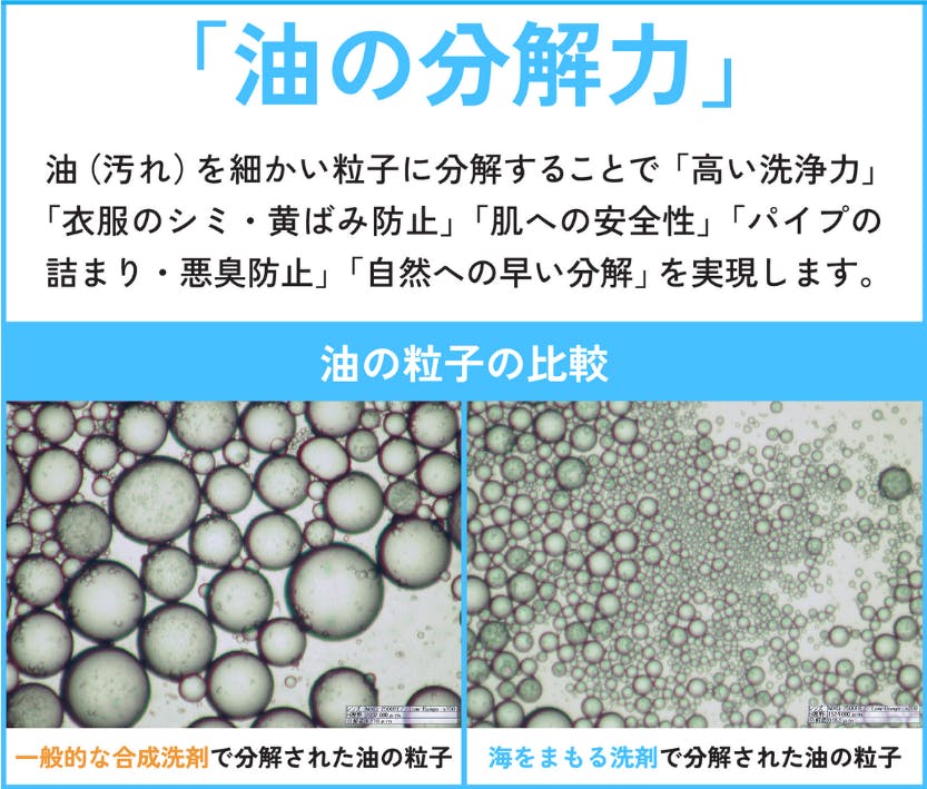 乳化分解という技術によって、洗浄力は標準的な洗剤と同等です。