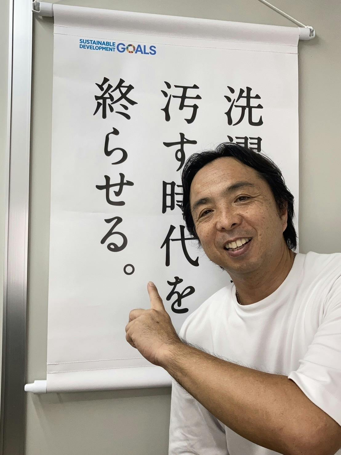 弊社は静岡県西部で一般・特殊品クリーニングを営んでいる会社です。私が環境に関心を持ったのは約12年前、地球温暖化やファストファッションのドキュメンタリー映画を自主上映した時、「私たちにできることは何だろう?」という疑問から生まれました。衣類をキレイにすることばかりを求めていて、代償として水を汚していたことに気付いたのです。これは家庭洗濯等の生活排水も大きく関わっております。