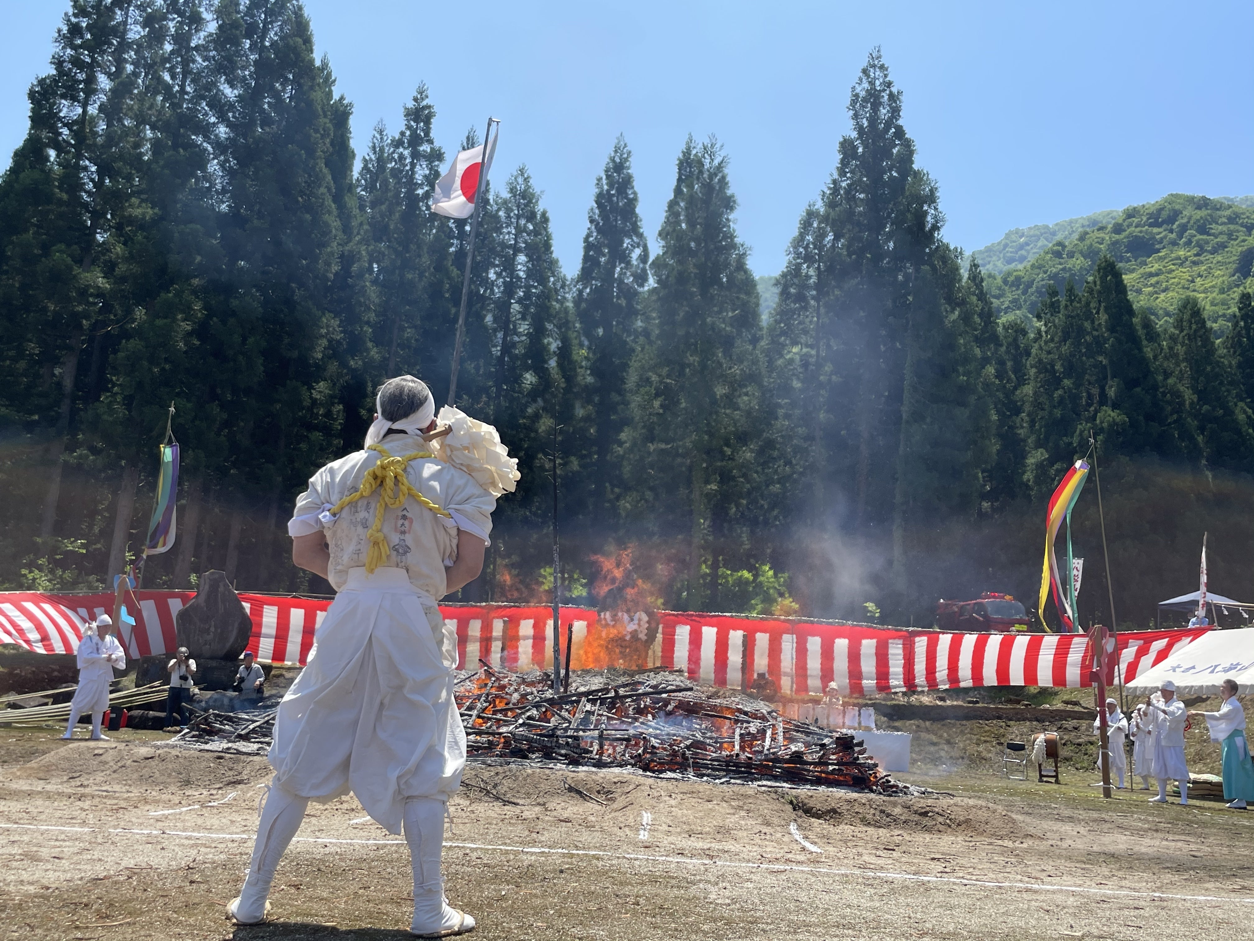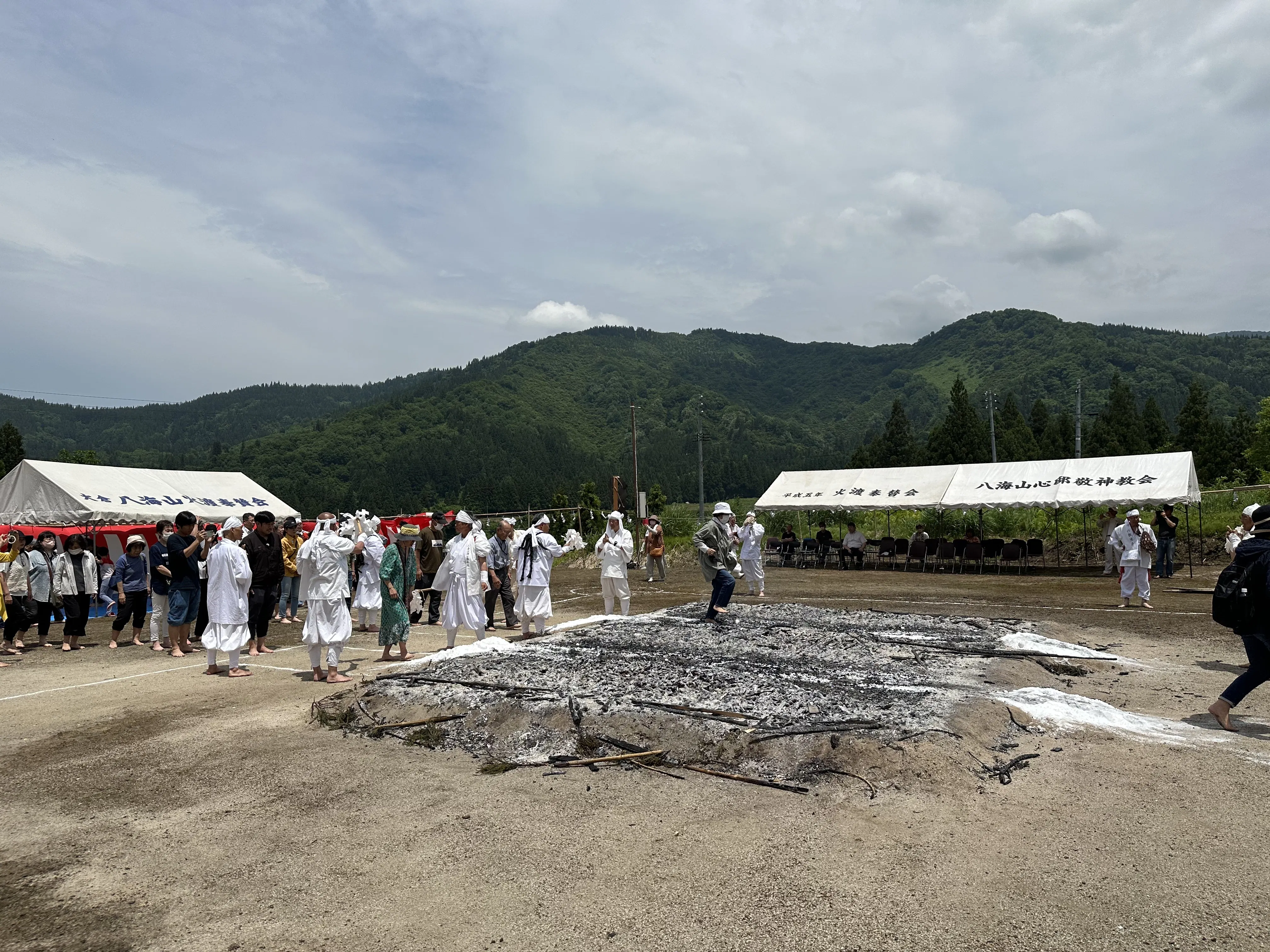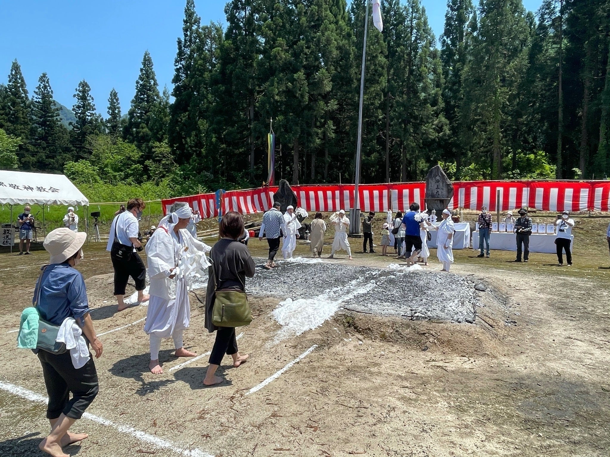 霊峰八海山の麓の火渡祭場で行われます。祭場中央に斎木を積み上げ、修験者が九字を切ったり、祓詞、般若心経を奏上しながら斎木を焚き上げ、穢れを払います。焚き上げる最中には諸祈願が書かれたお札も一緒に斎火で燃やします。燃え終わった後に灰の上を歩き、家内安全や無病息災などを祈願します。斎火(燃やしている火)や灰の上を歩くことで自身の穢れも祓われると言われています。霊峰八海山への信仰が盛んになり、当神社は八海山登山口の一つ、大倉口であったことから、修験者らによって火渡祭が執り行われるようになりました。最盛期には参拝者含め、祭場のほとんどの人が白装束を身にまとい、心願成就を願う姿が見られました。