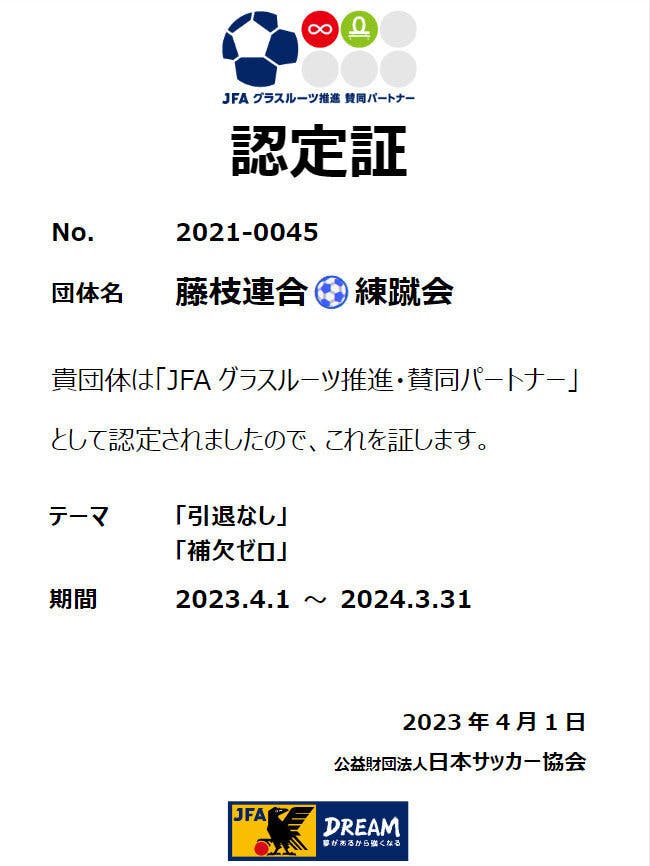 「藤枝連合⚽練蹴会」はJFAグラスルーツ推進・賛同パートナーとして「引退なし」「補欠ゼロ」をテーマに毎週土曜日に活動しています。