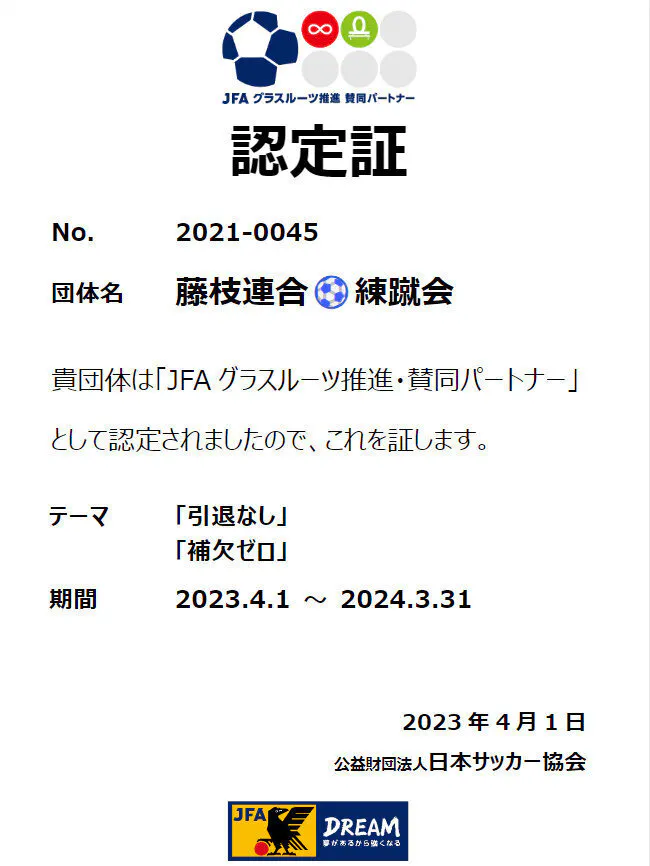 「藤枝連合⚽練蹴会」はJFAグラスルーツ推進・賛同パートナーとして「引退なし」「補欠ゼロ」をテーマに毎週土曜日に活動しています。