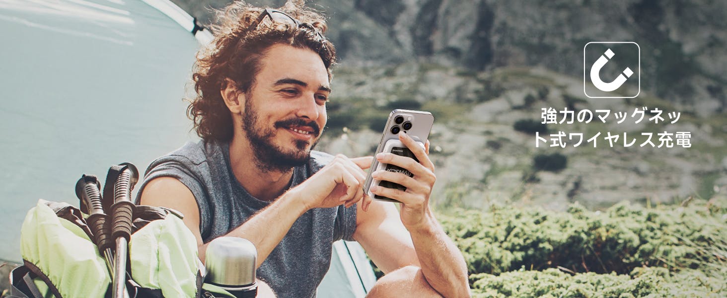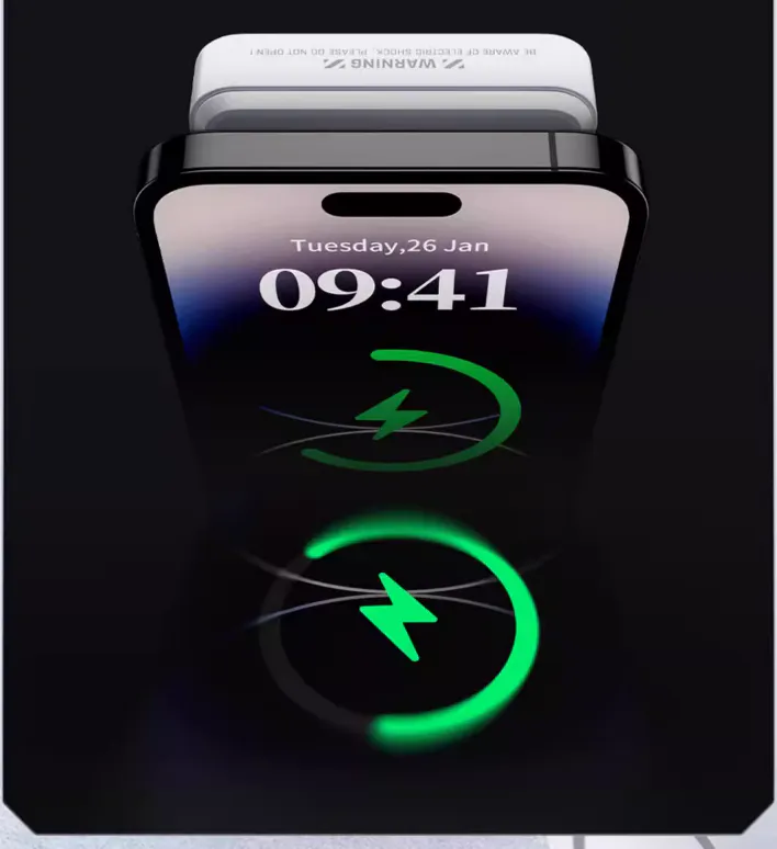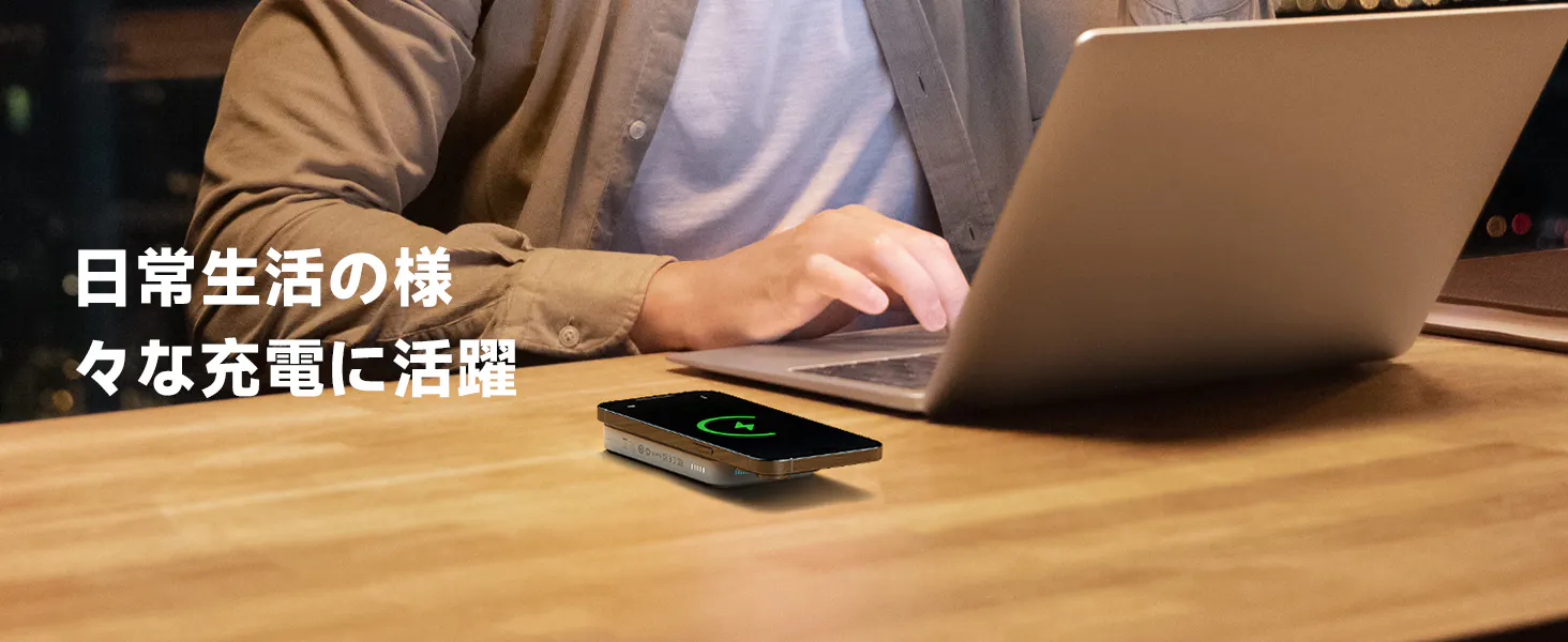 *iPhone12以前のAppleおよびAndroidモデルは、磁気リングまたは磁気吸着機能有する携帯電話ケースと併用する必要があります。携帯電話やデバイスがワイヤレス磁気充電モードをサポートしない場合は、モバイル電源として有線充電モードを選択し充電することができます。