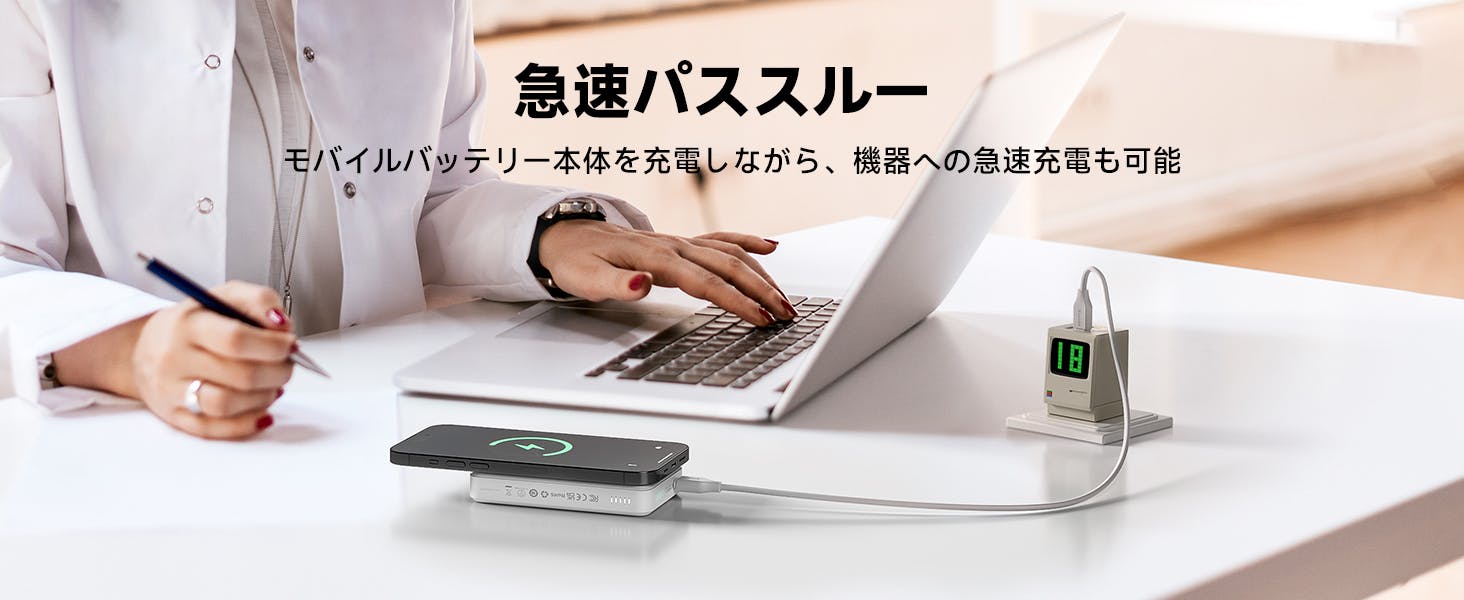 USB Type-C有線充電とワイヤレス充電とも対応可能で、どちらの方法も急速充電をサポートしています。 最大2台のデバイスの同時充電が可能で、有線充電モードとワイヤレス充電モードが同時に使用可能。家族や友人との外出時や出張時など、複数のスマートフォンやデバイスを充電したいときにも同時に使用できます。