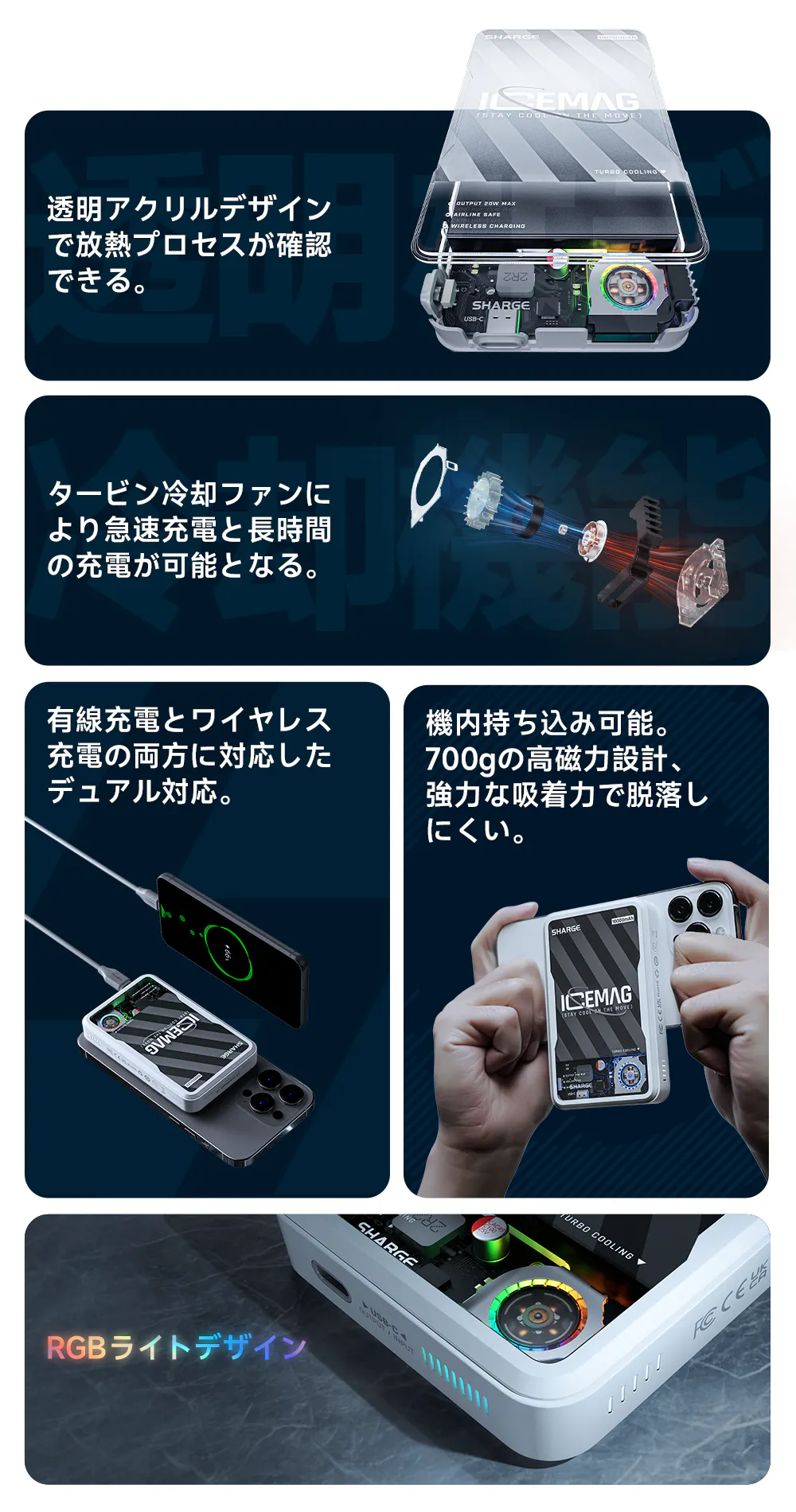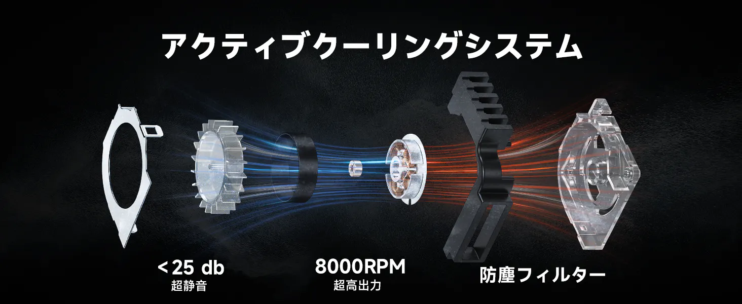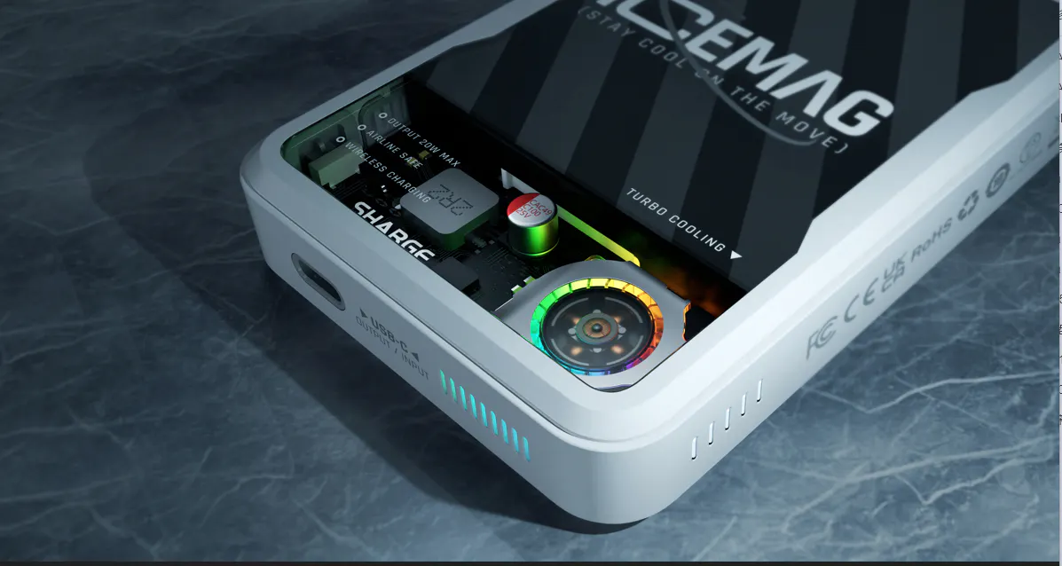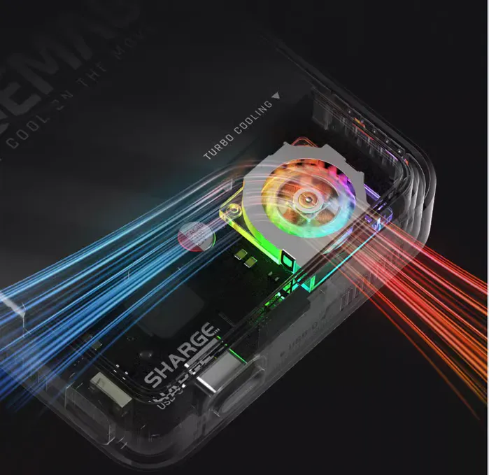 SHARGEのICEMAGはタービン冷却ファンを搭載しており、ファン回転数は8,000RPMで、長時間充電でモバイルバッテリーを過熱する心配はありません。
