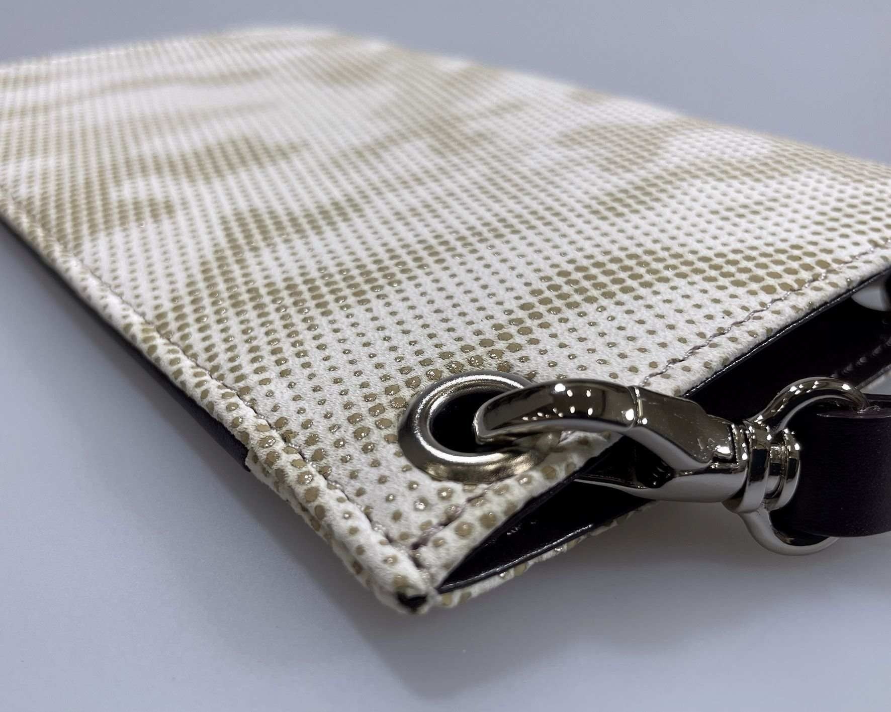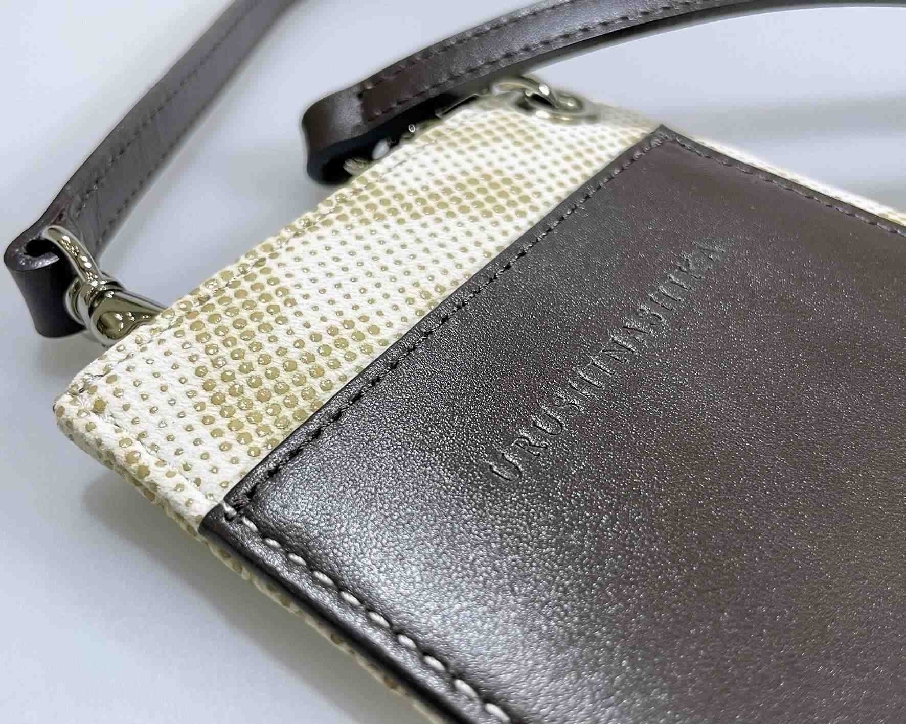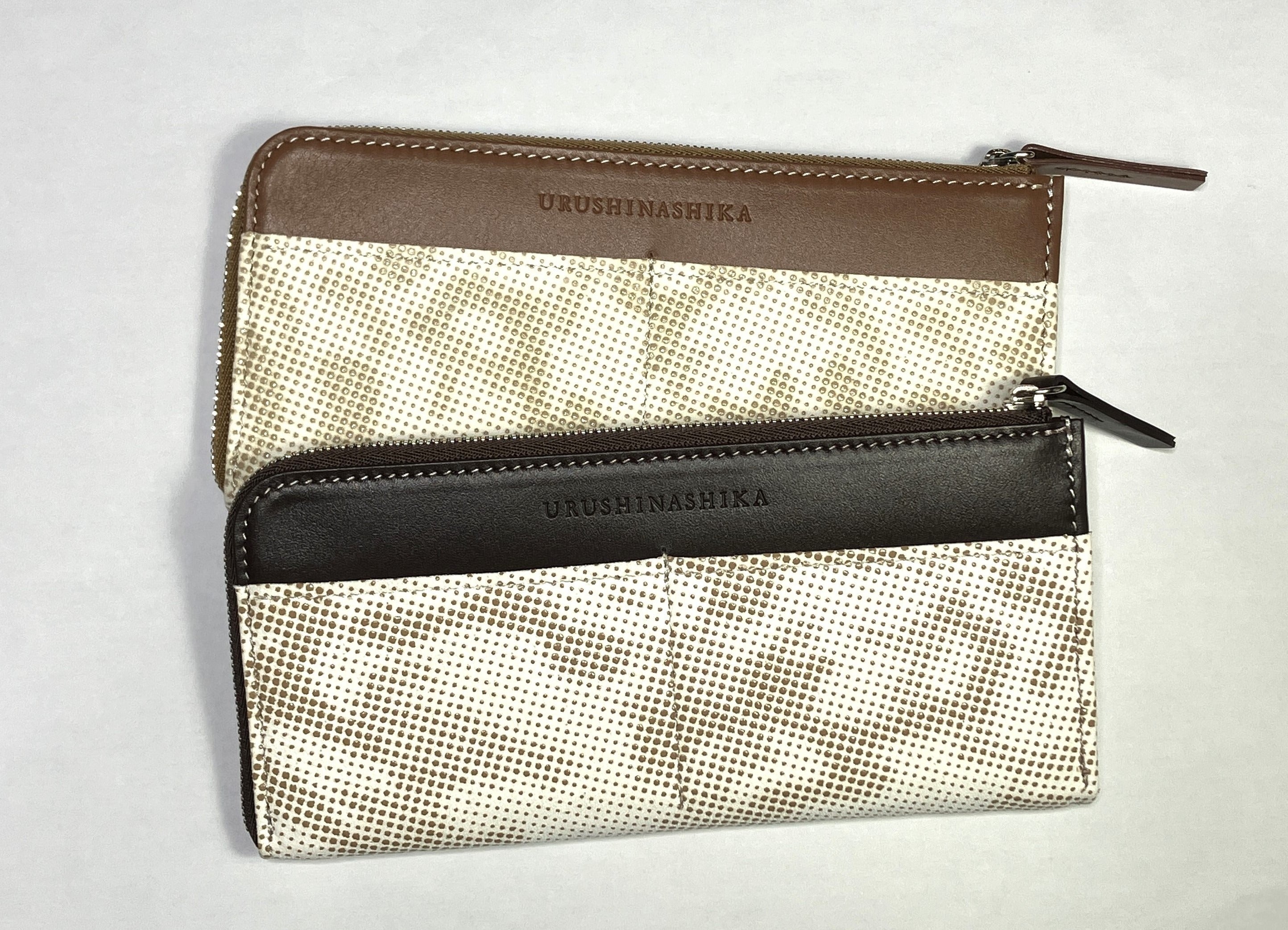 「URUSHINASHIKA」商品の印伝加工(漆付け)は「甲州印伝 伝統工芸士」の資格を持つプロが、又、縫製は日本鞄ハンドバッグ協会から1級に技術認定された鞄作りのプロが担っていて、Made in Japanです。 色は『白』を基本色としていますが、汚れにくいように撥水加工を3回施すなど印伝用に適した工夫が加えられています。