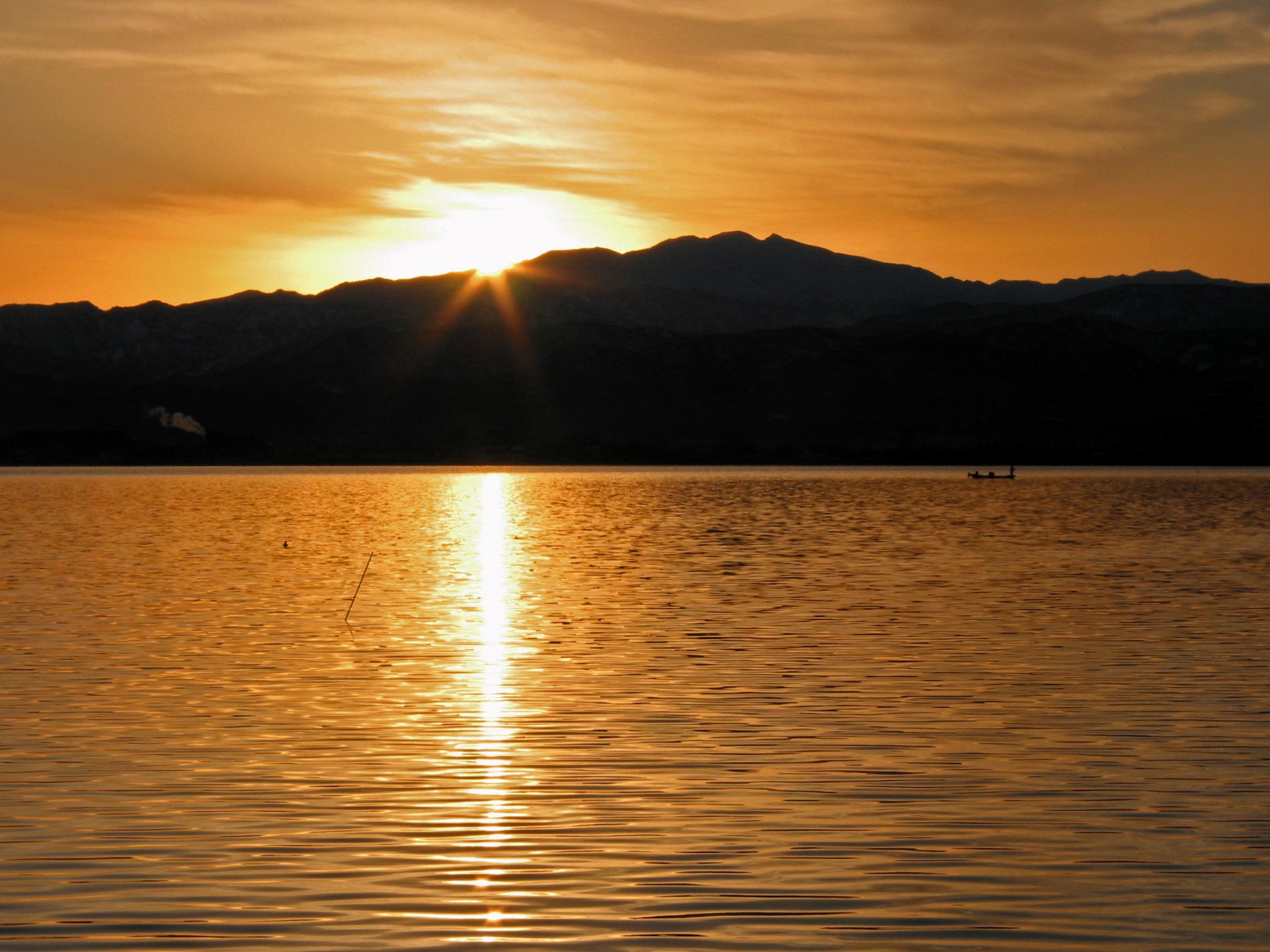 空気が澄んだ日は霊峰白山をバックにどこまでも青い光景が広がり、夕暮れは太陽が沈む光の道と共に真っ赤に染まる湖面。