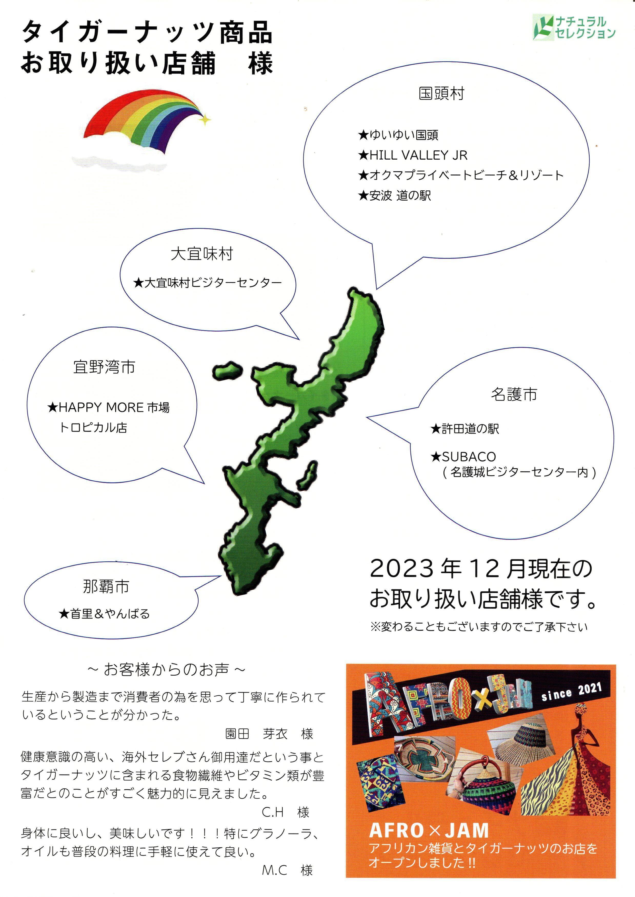 ちびくろさんぼ 様 栄養価バツグンのタイガーナッツ。ミルクの様な懐かしい味わいで、おやつにぴったり!また、店舗では、アフリカンテキスタイルを利用したバッグやアフリカ直輸入のカゴなどもあり、癒し空間に身も心も癒されています。タイガーナッツは、ちんすこうやドリンクにも利用されており、おススメです!!