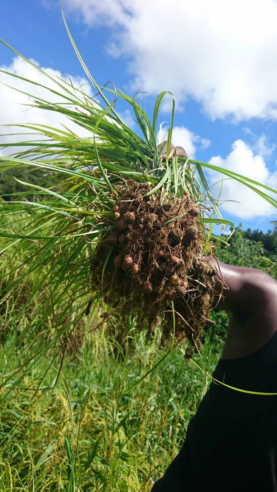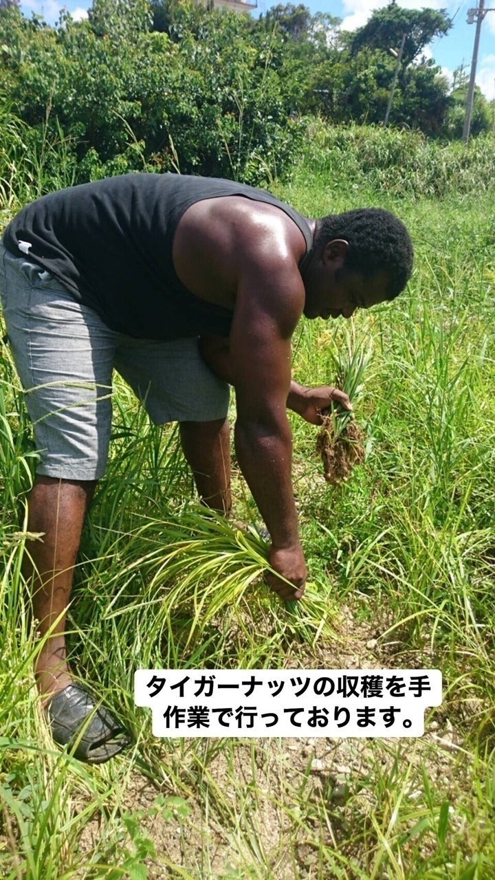 そして皆様とても気になると思いますが、なぜ国産のタイガーナッツの生産を始めたのか?それは、2016年の初めにたまたま見ていたテレビで道端アンジェリカさんがタイガーナッツを食べているというのを拝見しました。 ナイジェリア出身の社長は幼いころからおやつ代わりにタイガーナッツを食べており、日本ではあまりタイガーナッツ自体が知られておらず、ネットで検索しても、外国産のタイガーナッツしかないことに驚いておりました。早速、ナイジェリアにいる社長の兄弟へ連絡を取り、タイガーナッツを少し送ってもらいました。本当に沖縄で国頭村で栽培ができるのか?そこから私たちの挑戦は始まりました。20個~30個ほどのプランターに土の種類、たい肥、砂の配合をそれぞれ替え、どの配合がタイガーナッツの生産に一番適しているのか試験的に栽培を始めました。 沖縄北部の土は酸性土壌で水分を含むと粘土質になる粒子の細かい土がほとんどの赤土です。これがまずタイガーナッツの栽培には適しておりませんでした。試験的に栽培した結果、砂地で腐葉土を多く入れふかふかした状態の土に植えたタイガーナッツの出来が一番いいことがわかりました。その時にすでにタイガーナッツの可能性を信じて会社を設立し、すぐに村役場へ連絡し農地を借り、開墾、土づくりに一年ほどかかり2017年から本格的にタイガーナッツの栽培を開始しました。試行錯誤の日々の中、約半年後初めての収穫を終え国産タイガーナッツを手にしたときは本当に出来たことの喜びと達成感で感無量でした。そこから味の改良に取り組み現在ではとても美味しいタイガーナッツを生産することが出来ています。そこで、問題なのがタイガーナッツの収穫なのです。地中に実をつけるタイガーナッツなので長い時間と大変な労力をかけて収穫を行っていますが、より効率的に作業を進めるためにトラクターの購入もしくはリースを検討しています。