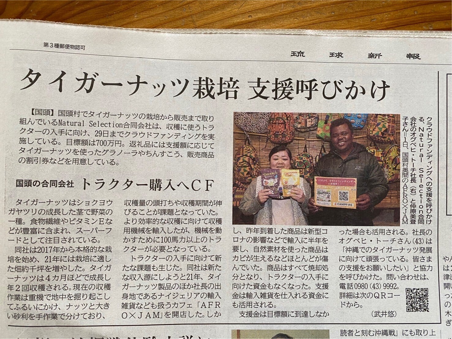 沖縄地元紙『琉球新報』様にクラウドファンディングへの挑戦を取り上げて頂きました。