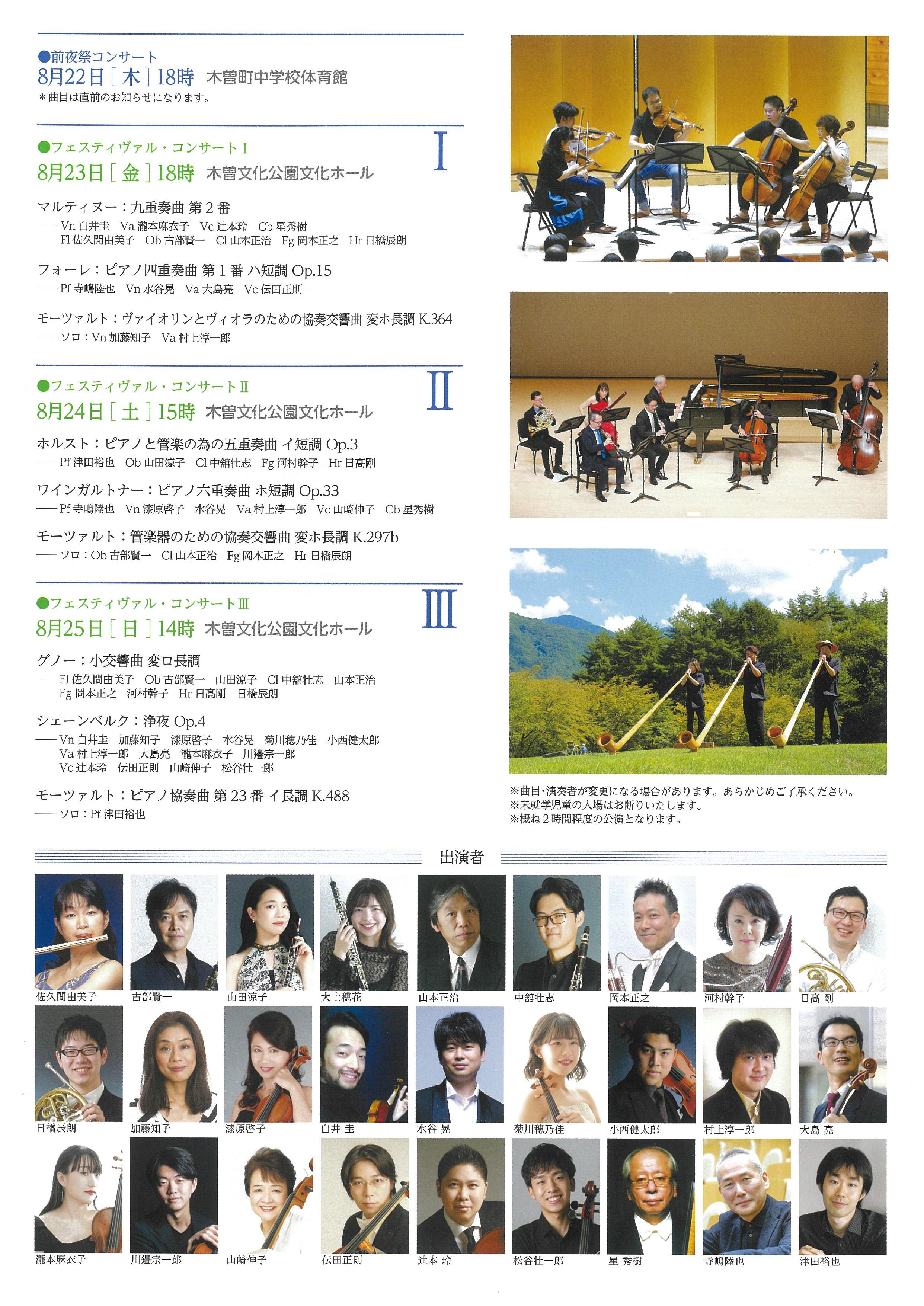 この記念すべき『第50回木曽音楽祭』を盛り上げるべく、例年より人数を増やし小編成のオーケストラによる演奏を行います。また、地域の子供達にクラッシック音楽をより身近に感じてもらえるように、演奏家が地元の小・中学校へ訪問して演奏も行います。