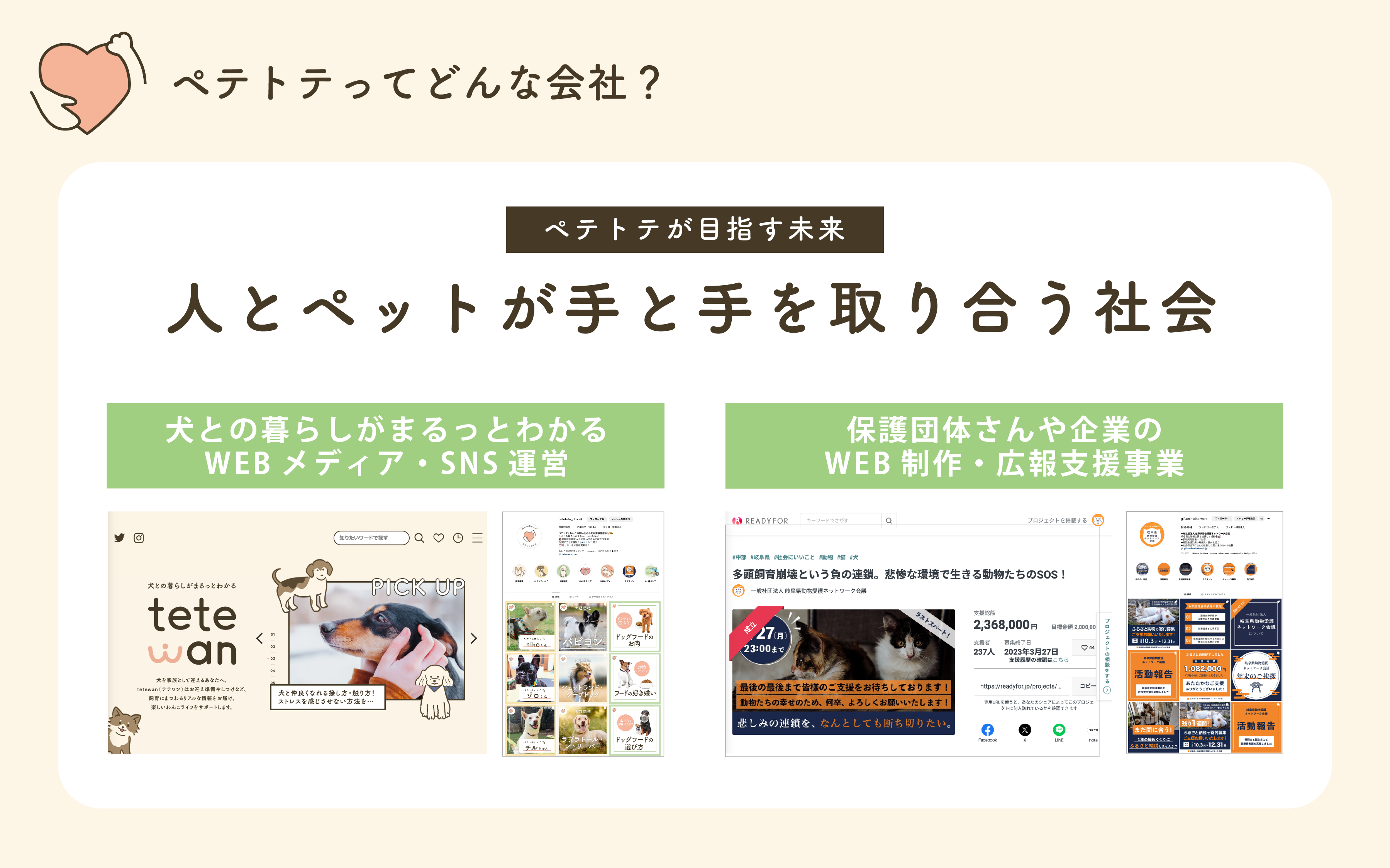 私たちは「人とペットが手と手を取り合う社会」を目指して、犬を飼う前や飼い始めの方に向けた情報発信や、動物愛護に携わる団体様の広報のお手伝いをしてきました。