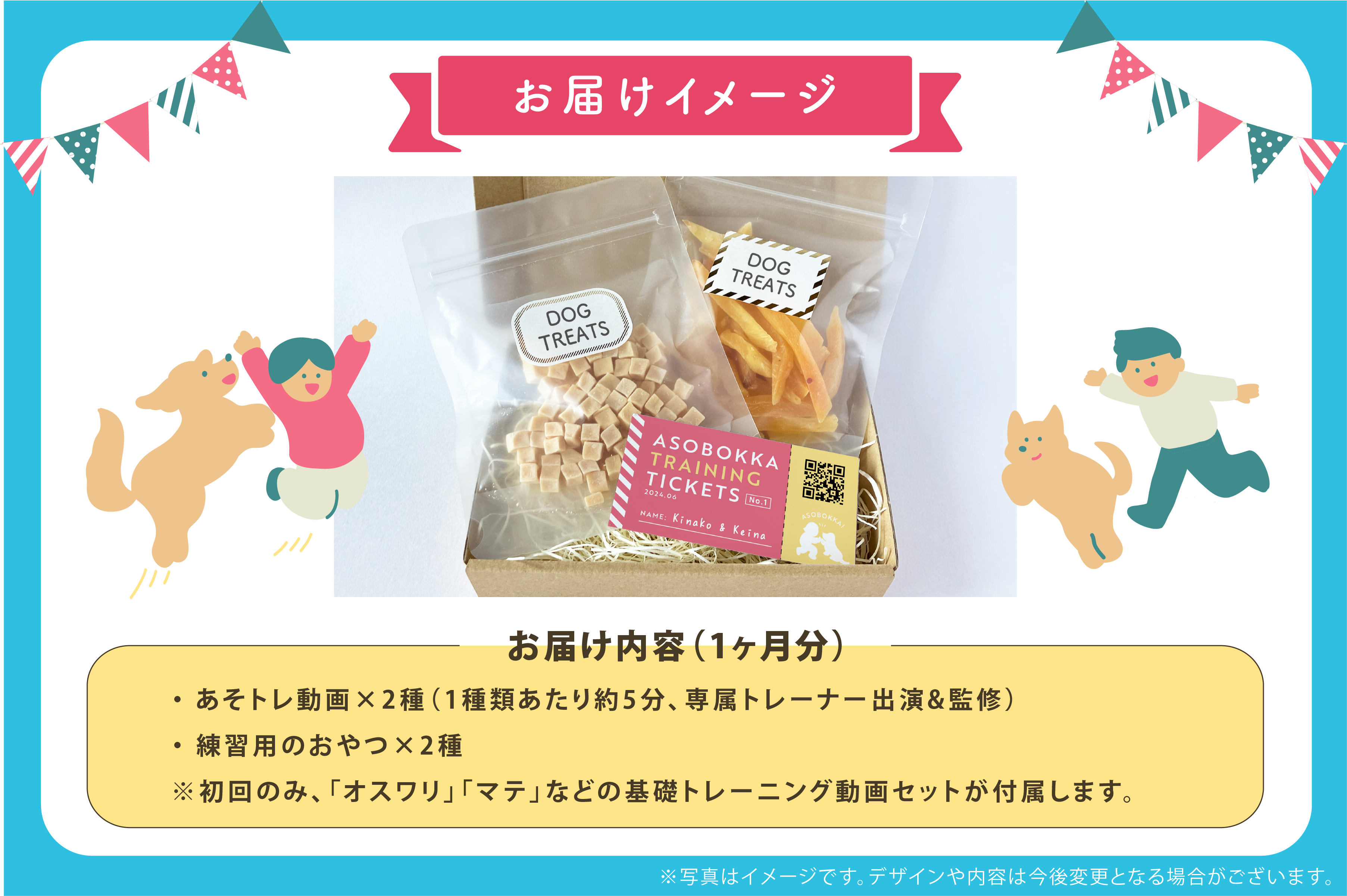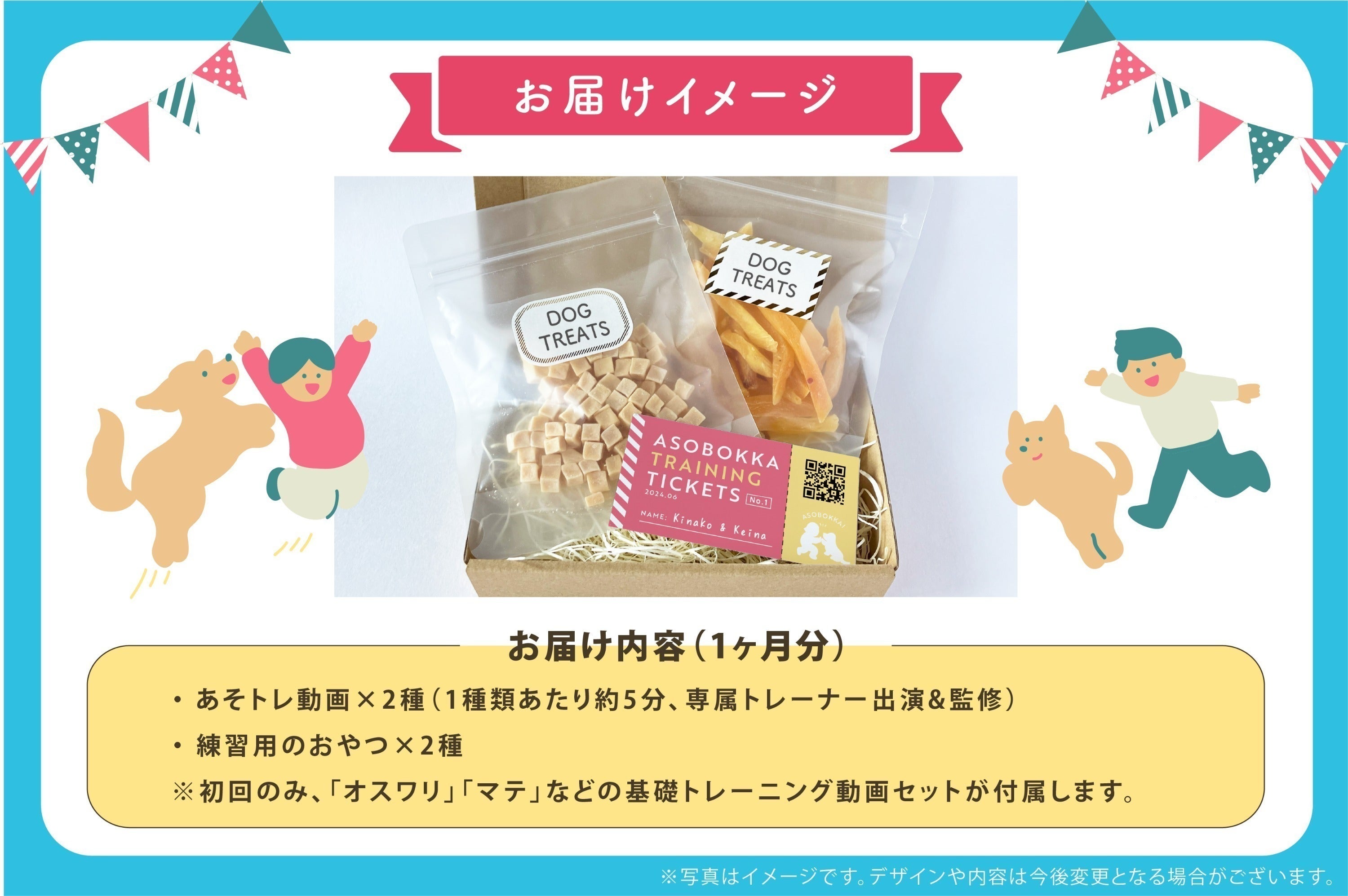 毎月、ドッグトレーナー監修のトレーニング動画2本とおやつ2種類をおうちへお届けします。