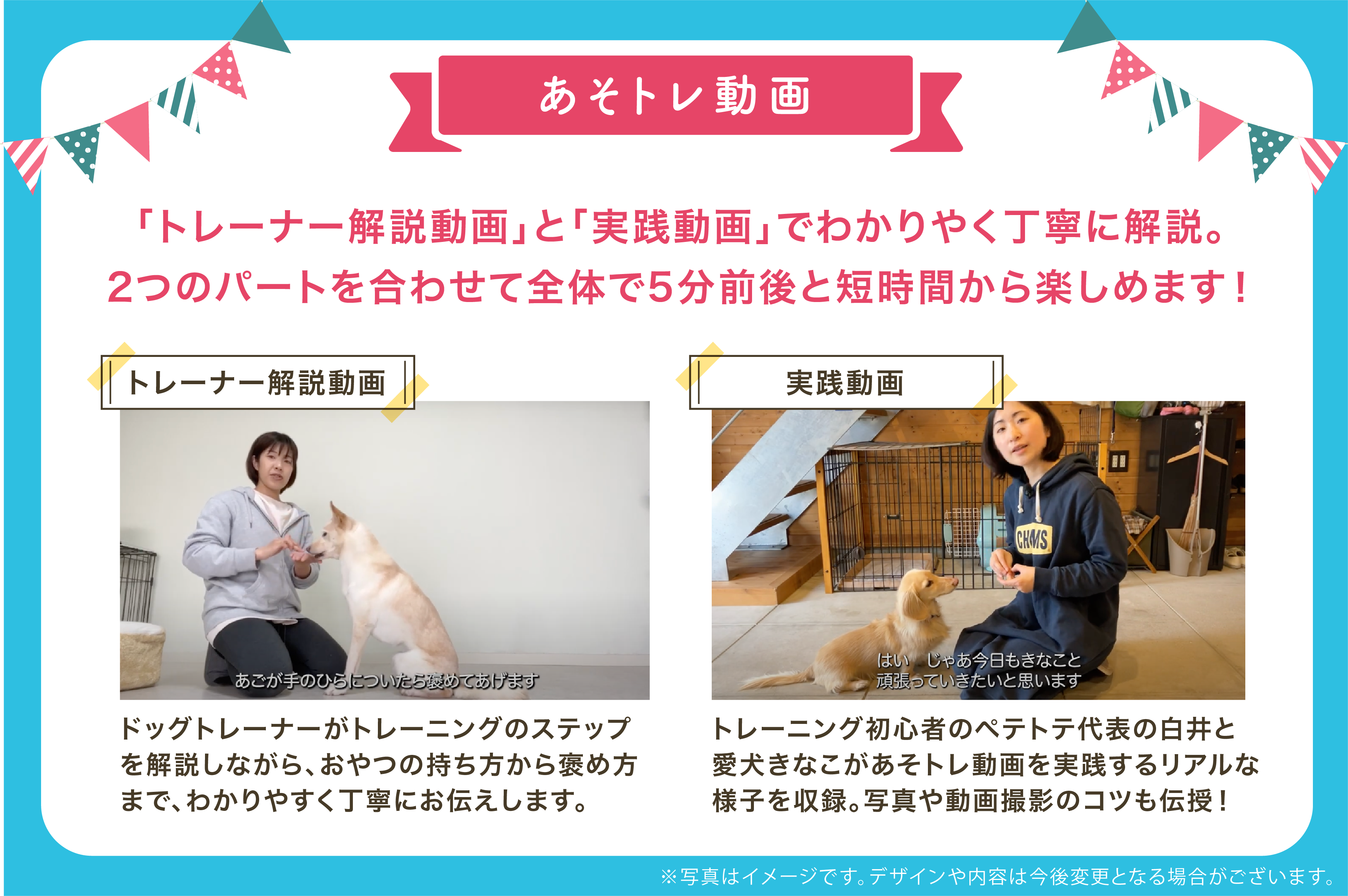 「実践動画」では、トレーニング初心者のペテトテ代表の白井と愛犬きなこがあそトレ動画を実践するリアルな様子を収録。ただやり方を伝えるだけでなく、一緒にチャレンジすることでより身近に感じてもらえる構成となっています。
