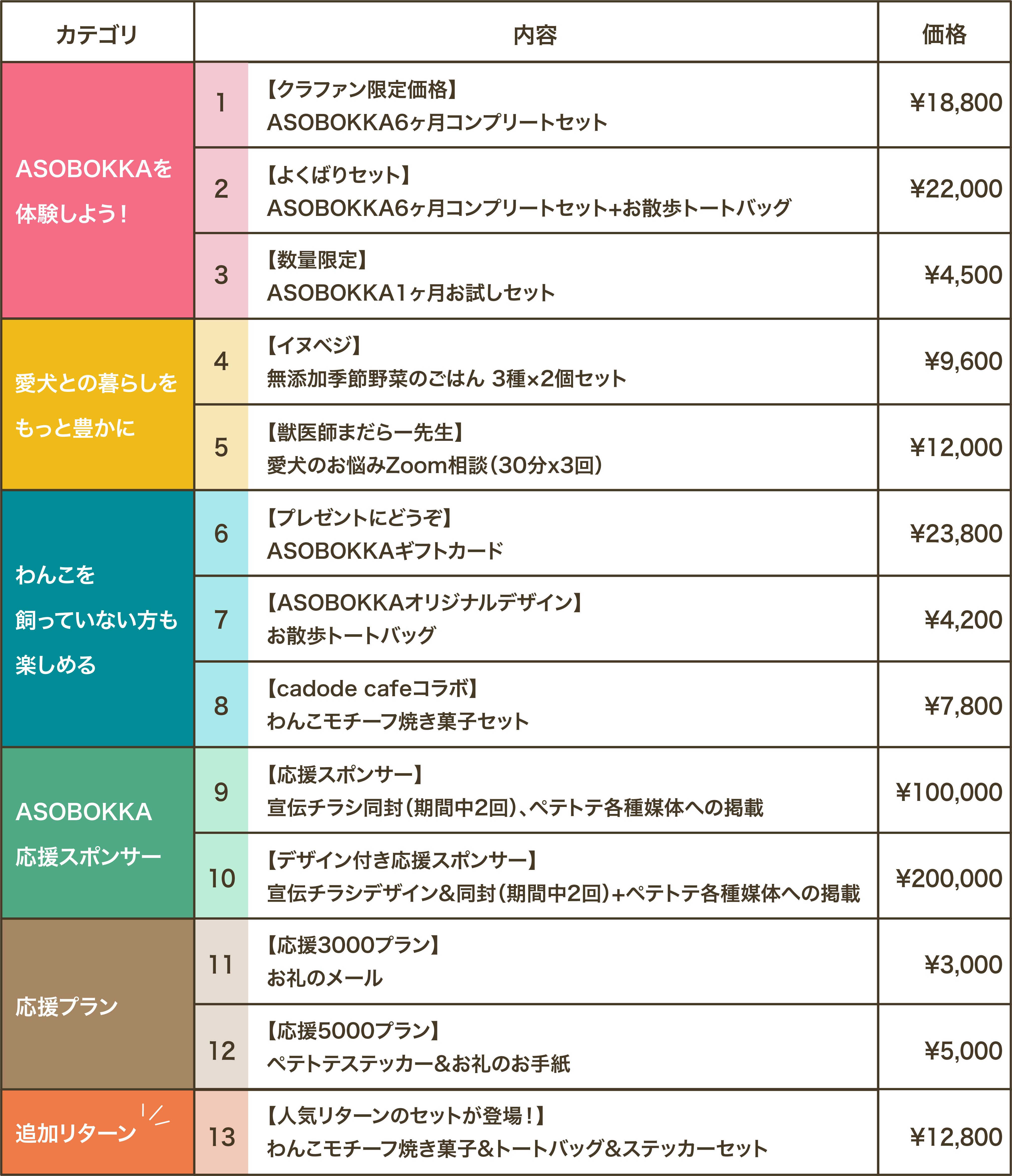 ASOBOKKAそのものをお楽しみいただけるリターンのほか、犬を飼っている方も飼っていない方もお楽しみいただけるリターンを多数ご用意しました!