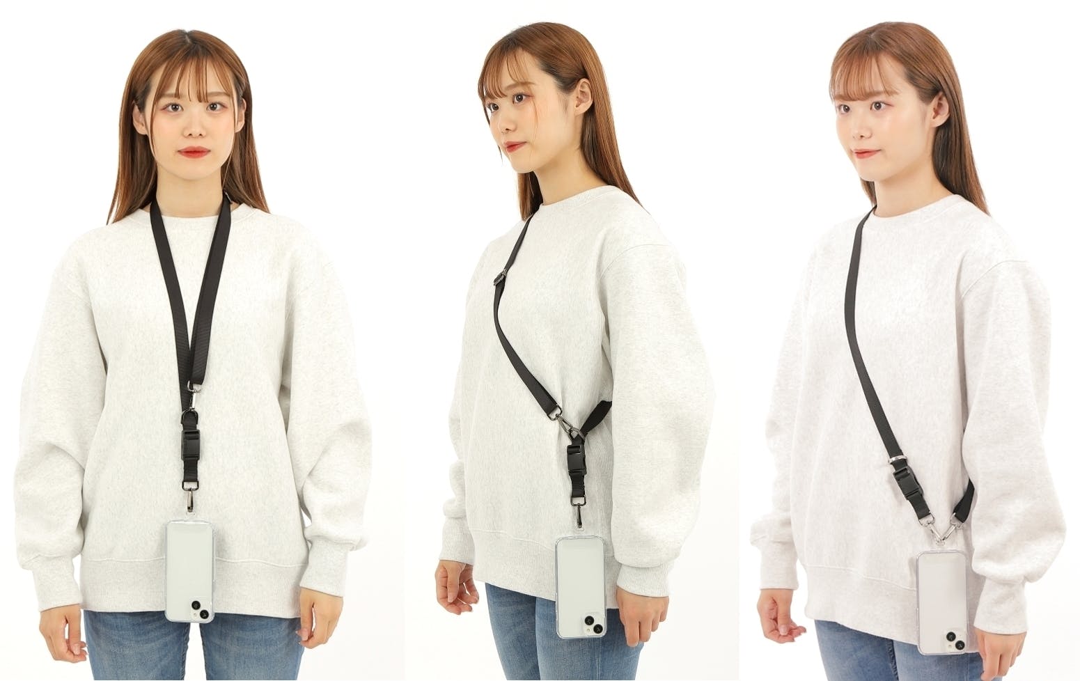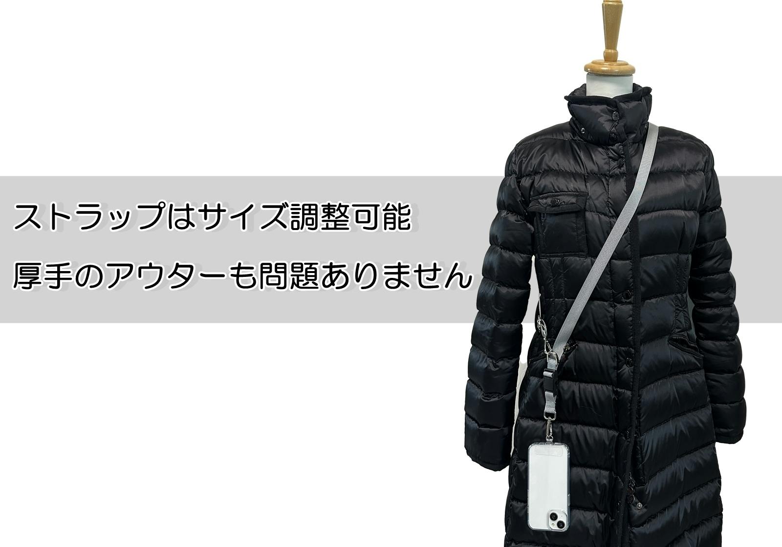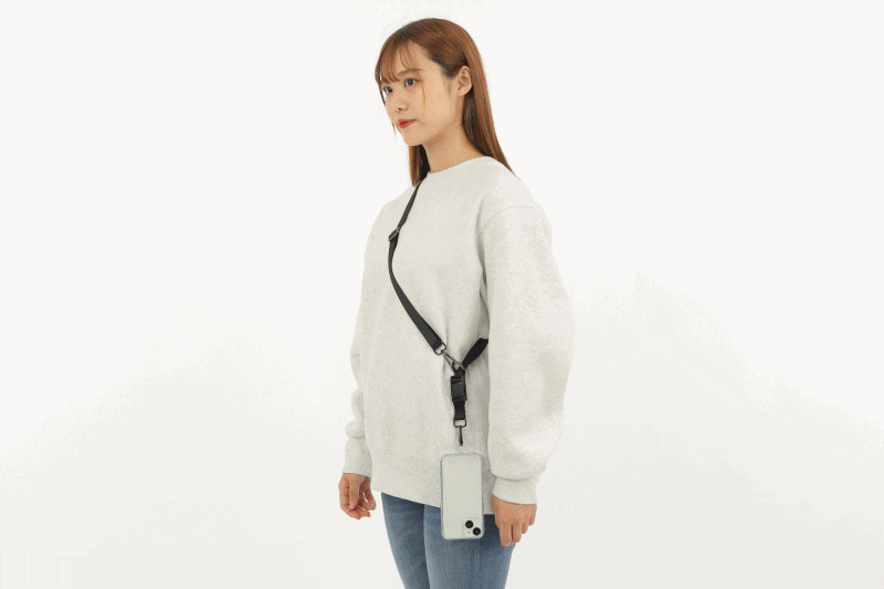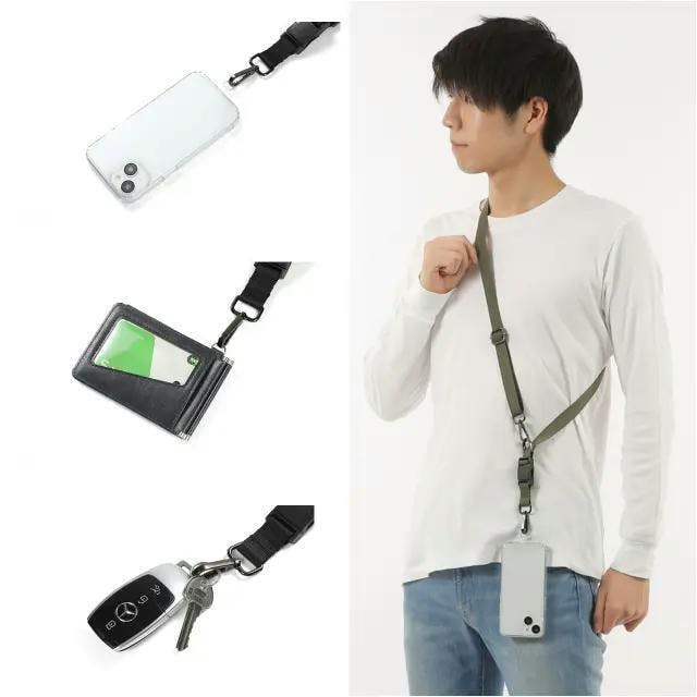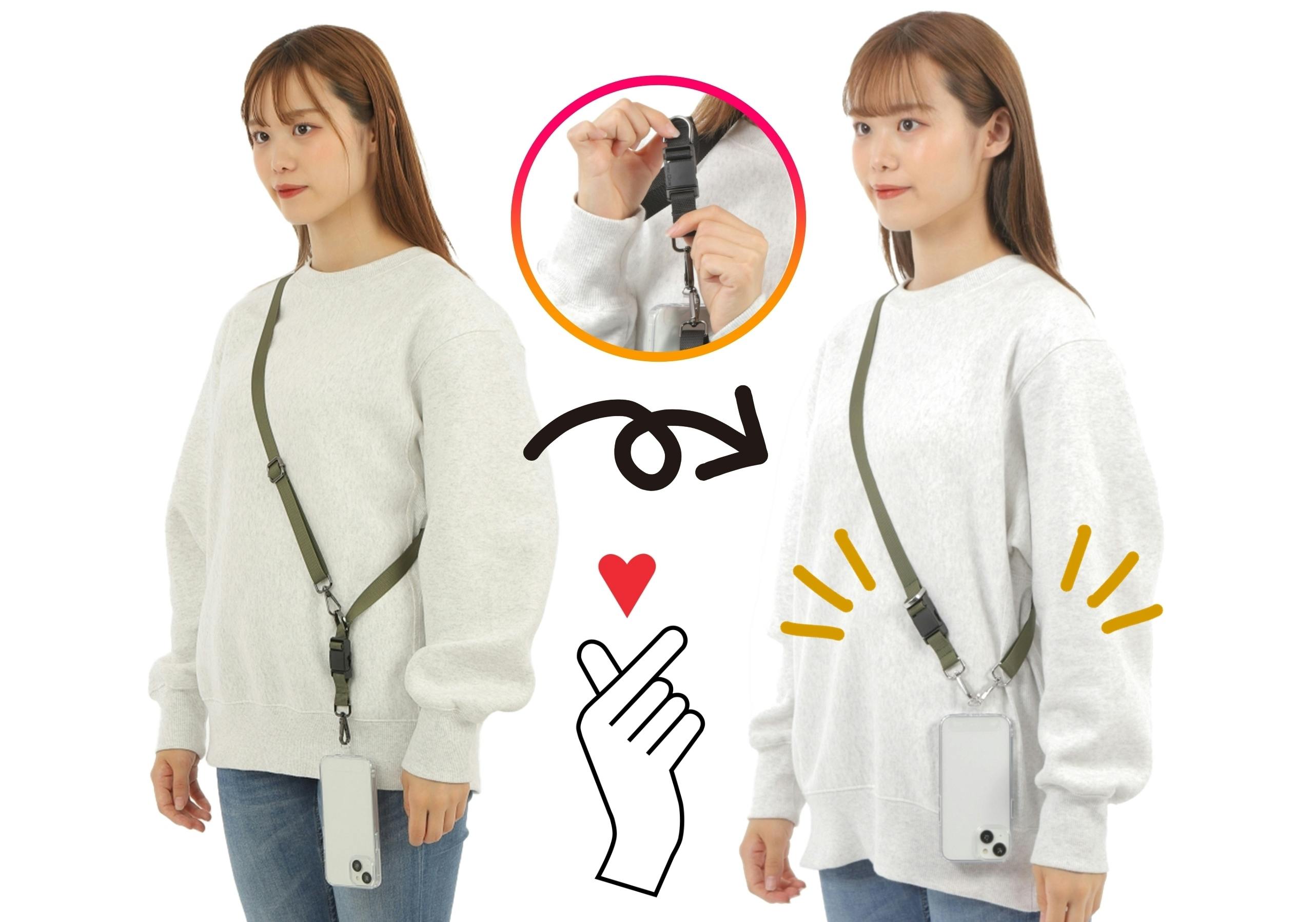 首から下げたり(ネックスタイル)、肩に掛けたり(ショルダースタイル)、バッグやポケットがなくても手ぶらでスマホを持つためのストラップ。